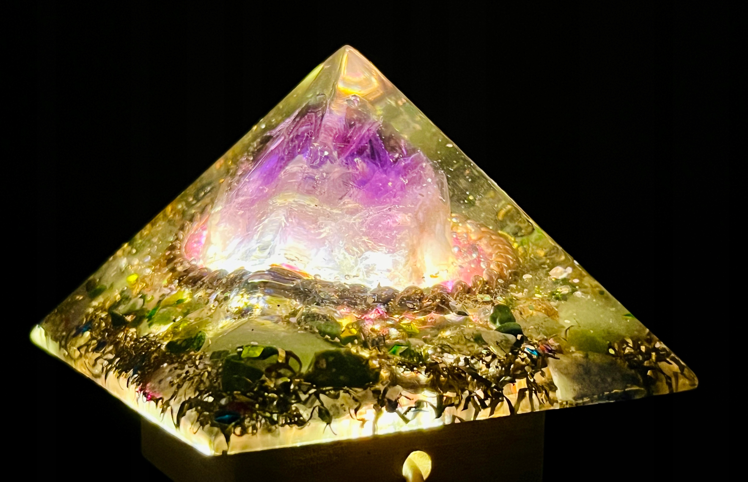 У цій піраміді вгорі є прекрасний зразок кристалічного аметисту, оточеного рожевими снарядами, зовні є тензорне кільце для зміцнення, яке передає негативні емоції, ставлячи захисні бар'єри. Агент наповнений гірським кристалом і сумішшю різних металів. Крім того, застосовано спеціальний шар смоли, щоб енергія поширювалася ще більш гладкою. Кожні побажання нарешті перевіряються нами, за умови просочення для захисту зовнішнього шару та очищення. Завдяки цьому, Orgonite має скляну структуру - це кристал прозорий, блискучий і довговічний. Резистентність до УФ -променів