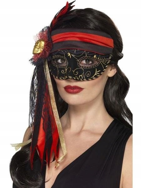 Маска виготовлена з пластику, чорного кольору з золотистим декором. Зверху маска покрита матеріалом, що імітує піратську бандану. Збоку вільно звисають стрічки чорного, червоного та золотого кольорів. Маску також прикрашає маленький золотий череп. Кріпиться на гумку.