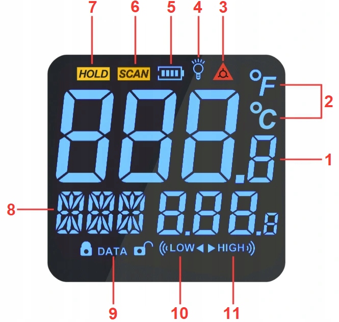 Пристрій оснащений лазерним прицілом, що дозволяє точно приєднати перевірену точку. Пристрій використовує якісні матеріали, а ергономічна конструкція покращує зручність використання термометра. Дисплей підсвічування дозволяє працювати з пристроєм у темряві. Пірометр оснащений функцією автоматичного перемикача, збільшуючи економію споживання акумулятора.