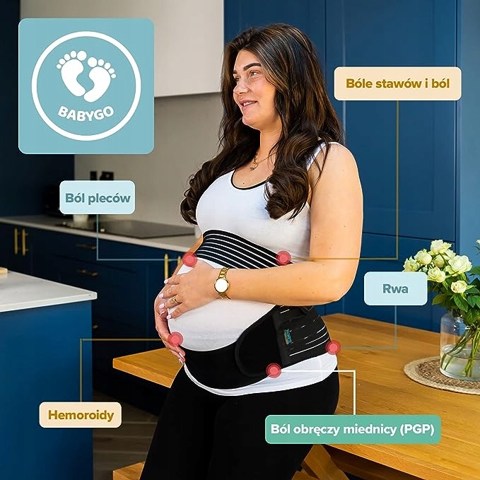 Підтримуючий ремінь для вагітних Babygo ефективно запобігає болю в попереку, тазу та стегнах. Надійна допомога на останніх тижнях вагітності! Гарантований комфорт під час сидіння завдяки еластичній частині живота.