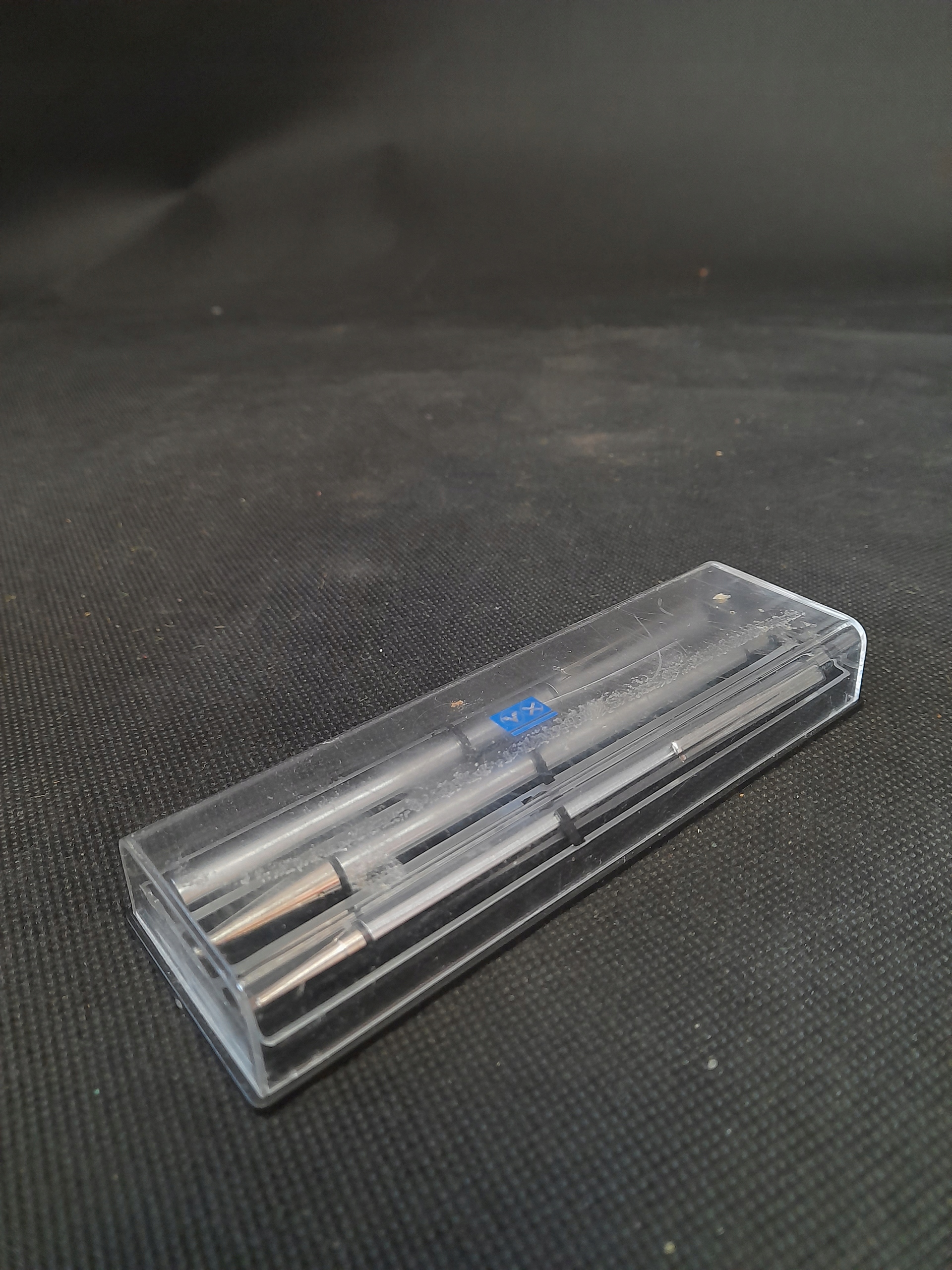 Продається срібний письмовий набір невідомої марки. Набір складається з олівця, ручки та файнлайнера. Стан речей видно на фото, помітні подряпини та невеликі забруднення. Кулькова ручка та файлайнер не пишуть, картриджі потребують заміни. Оригінальна упаковка.