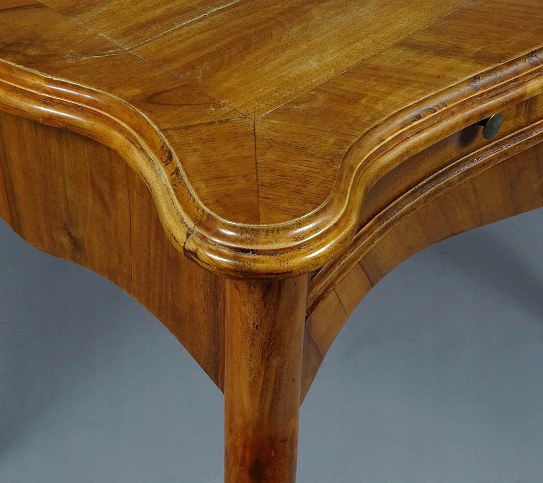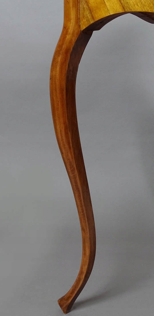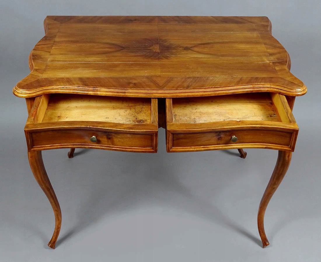 зі зігнутою лінією скелета, що підтримується на чотирьох втікачах, струнких ногах. Стільниця акуратно виступає за межі контуру структури, з хвилястою лінією спереду та з боків, і на спині, що дозволяє встановити стіл за стіною. У глазурі, два ящики, з смужкою на периметрі обличчя та латньою струною посередині.