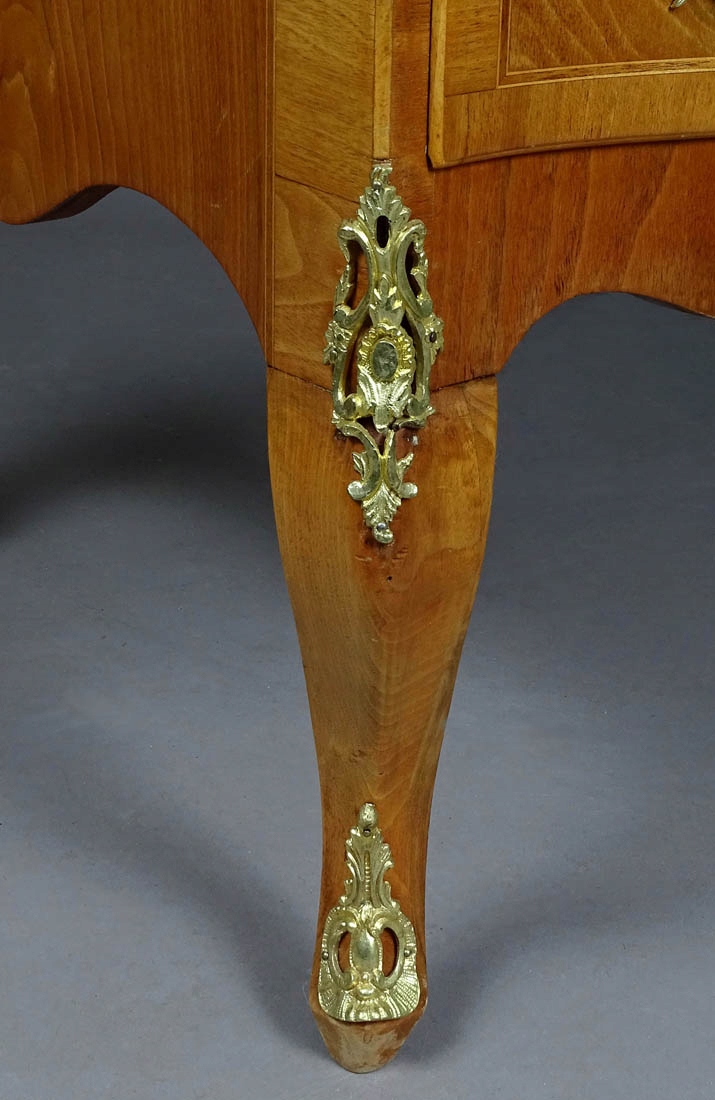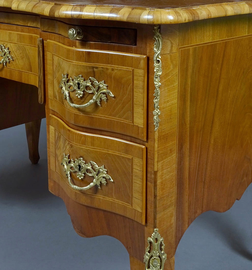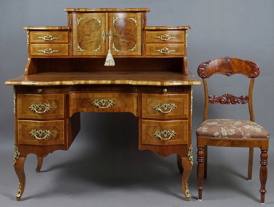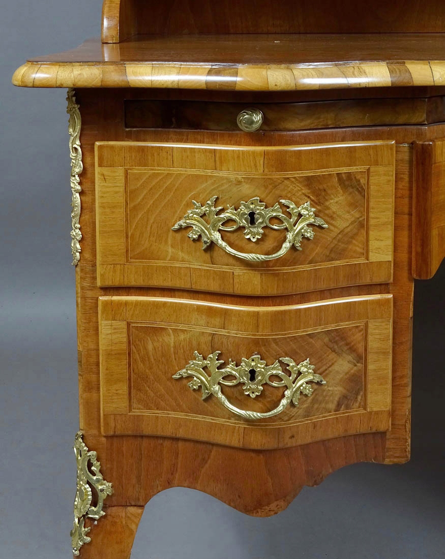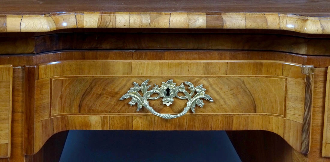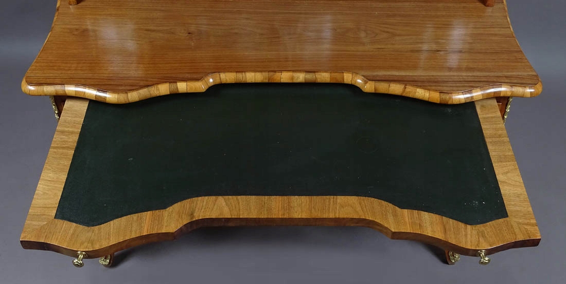 з прямими боками та вигнутою передньою частиною, що підтримується чотирма ніжками кабріолів, прикрашених на обох передніх ніжках латунними, ажурними аплікаціями. Надбудова з хвилястою лінією рами, з чотирма шухлядами, дві збоку, закриваються посередині парою вигнутих дверей на замок і ключ. Внизу дві шухляди з обох боків із заокругленим лицем, з латунними шухлядами та врізним сталевим замком, посередині одна шухляда з увігнутою передньою частиною. Під основною стільницею є висувна допоміжна стільниця, обшита темно-зеленою шкірою.
