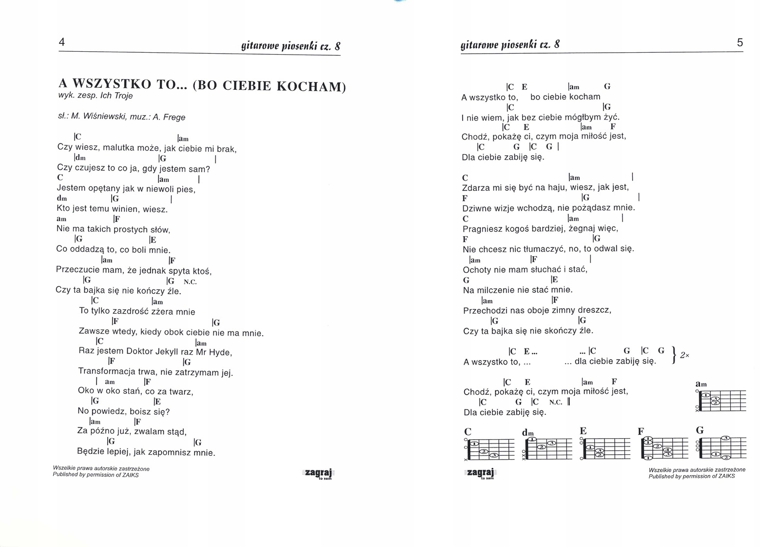 ▶️Частина пісень під гітару. 8 – Пісенник для гітари з акордами та діаграмами акордів!Необхідний для кожного меломана, який хоче поєднати навчання гри на гітарі з виконанням найкращих польських хітів. Створений брендом STUDIO BIS, цей унікальний пісенник є чудовим навчальним матеріалом як для початківців, так і для досвідчених гітаристів. Завдяки цьому ви можете грати та співати пісні таких музичних легенд, як Dżem, Maanam, Kult або Anna Jantar.