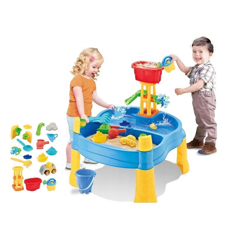 Water Table 2in1 Sandbox від бренду WOOPIE - ідеальна іграшка для гри з водою та піском. У наборі 14 аксесуарів: 4 форми, лійка, м'ясорубка, лопатка, граблі, іграшкова машина та 2 кораблика. Стіл має 2 виїмки - одну заповніть водою, а іншу піском, що дозволяє грати будь-де. Дитина може налити воду в м'ясорубку і спостерігати, як вода стікає. Набір призначений для гри як вдома, так і на вулиці. Ідеально підходить для гри вдома, на пляжі або в пісочниці.