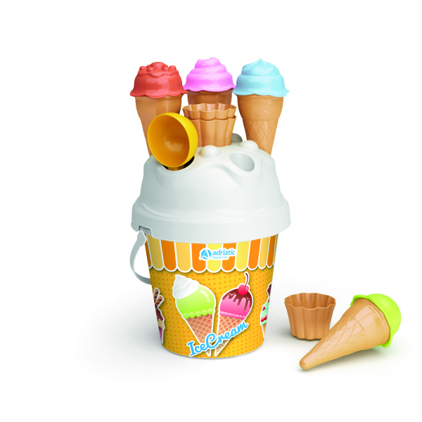 Набір мрії, щоб створити власний магазин морозива або кондитерські вироби! Набір чудовий не лише для домашньої пісочниці, але і на пляжі у відпустці. Набір складається з: * відро - барвистий солодкий мотив, що прикрасить відро, безумовно, принесе посмішку на обличчі кожної дитини * кришки на відрі з 5 отворами для форм та ложки * 4 форми у формі куточка морозива * 3 форми у формі кексів * ложка для нанесення морозива та клопотів Магазин морозива, про який мріє кожна дитина. Набір дає багато можливостей різних ігор.