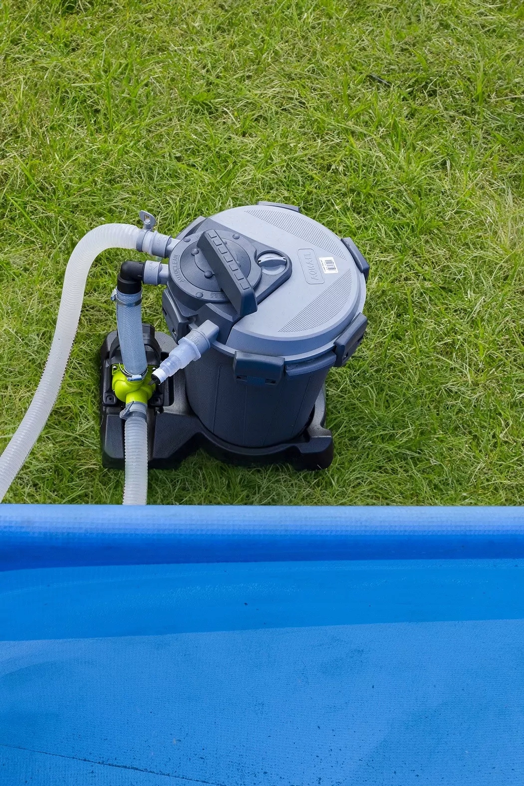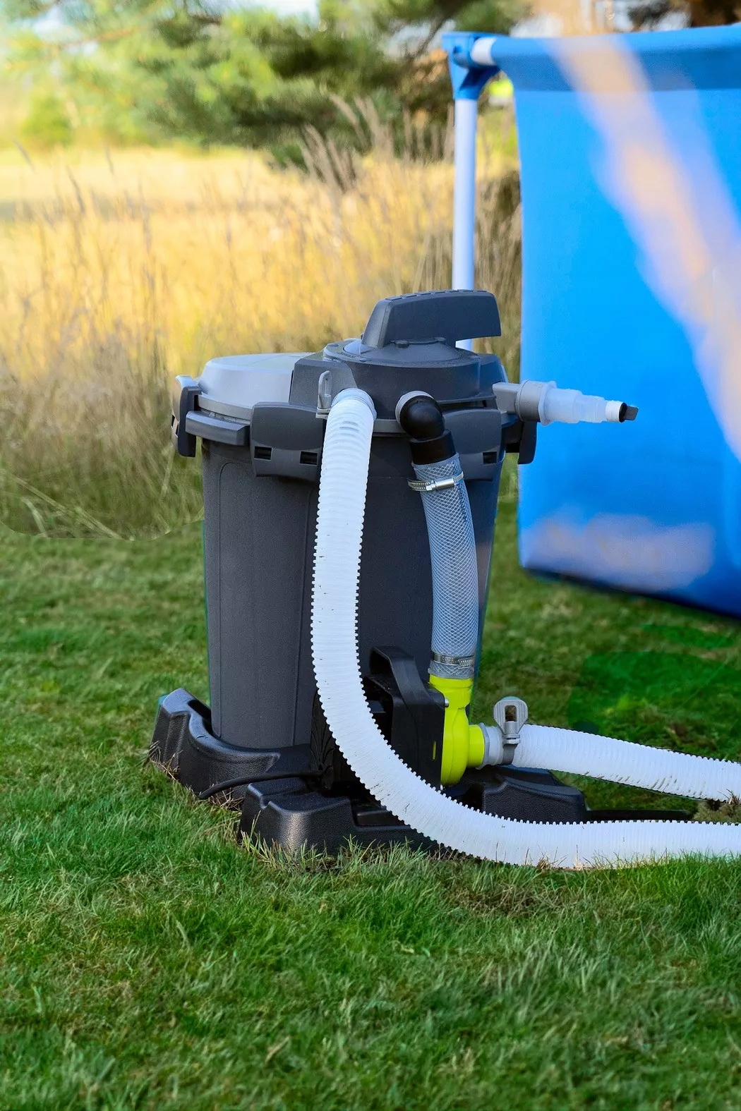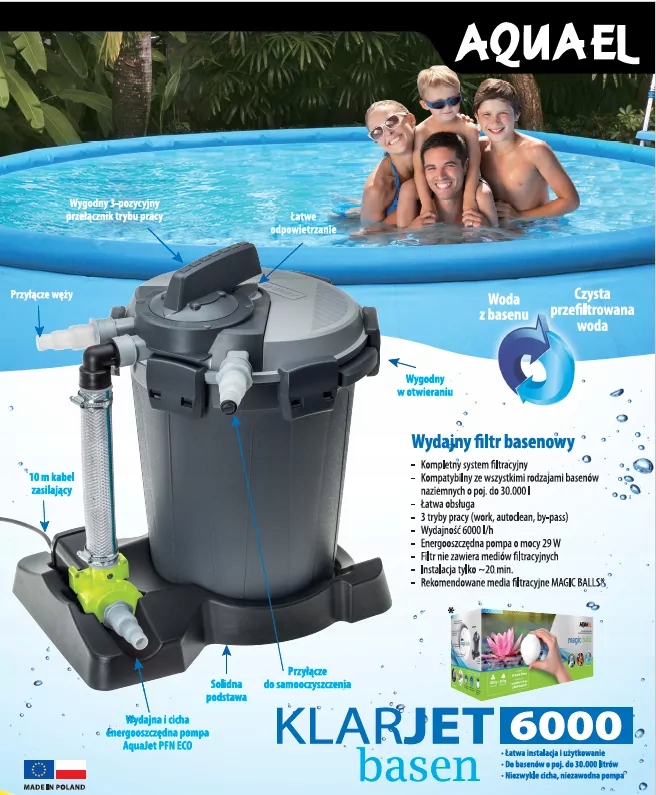 KLARJET BASIN 6000 - це пісочний фільтр, адаптований для всіх типів басейнів об'ємом до 30 000 л. Фільтр приводиться в рух насосом ECO 6000. Завдяки високому тиску всередині KLARJET BASIN 6000 ефективно очищає воду басейну від усіх механічних домішок, зберігаючи її в стані ідеальної прозорості. Його додатковими перевагами є функції AUTOCLEAN і BY-PASS, які полегшують очищення та обслуговування пристрою. Функція AUTOCLEAN дозволяє здійснювати автоматичне очищення фільтра без необхідності вимикати насос і відкривати його корпус. Система BY-PASS, у свою чергу, дозволяє відкрити фільтр без необхідності вимикати насос. Після переведення важеля в положення BY-PASS вода протікає через кришку фільтра, минаючи шар фільтра. Завдяки цьому при необхідності пісок можна легко замінити на новий. Замість піску можна використовувати фільтр-кульки. Найкраще підійде Aquael Magic Balls 700 г, що робить фільтр ефективнішим та ефективнішим.