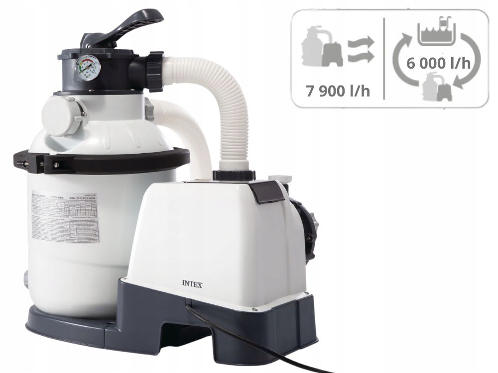 Електричний пісочний насос фільтрує воду від будь-яких домішок продуктивністю 7900 л/год. Для ефективної роботи насоса необхідно 23 кг піску з зернистістю 0,4 - 0,8 (25 кг в комплекті), або 16 кг кварцового скла або 650 г фільтрації кульок. Не використовуйте басейн під час роботи насоса.