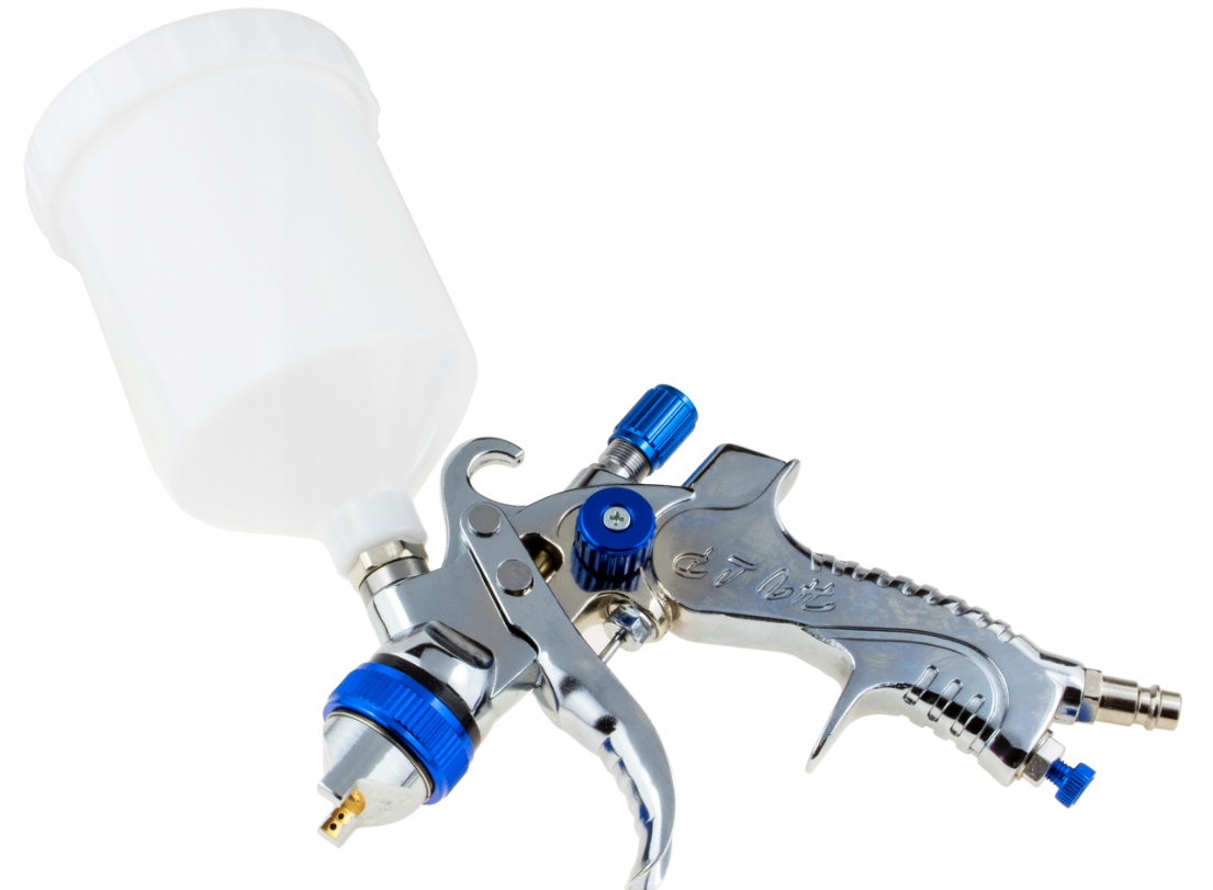 - Повітря (встановлення кількості матеріалу по відношенню до повітря) проводиться за допомогою регулятора повітря, встановленого перед пістолетом у пневматичній мережі і точно використовуючи ручку в нижній частині пістолета (кількість кинутих матеріалів) Після вибору відповідної насадки та тиску продукту можна подальше контролювати витрати на вихід, змінивши стрибок голки через ручку, розташовану в задній частині тіла. Він керуватиме шириною потоку, регулюючи повітря, спрямоване на кути на повітряній головці. Таким чином, повітря контролюється повітряними розетками і дозволяє змінити потік з плоскої (широко відкритої) на круглу (закрито).