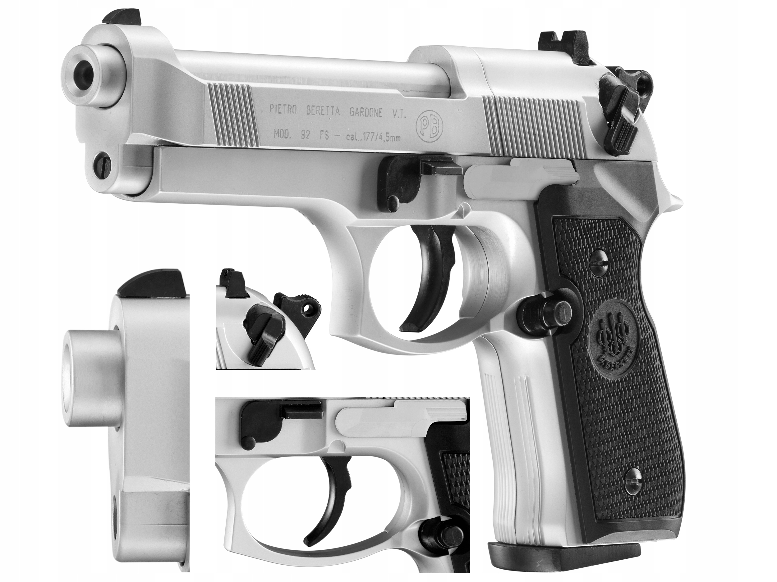 Beretta M92 FS нікель 4,5 мм Diabolo CO2 – це вражаюча пневматична зброя з металевою конструкцією, оснащена нарізним стволом і ударно-спусковим механізмом SA/DA. >, двостороннім запобіжником і текстуровані накладки.