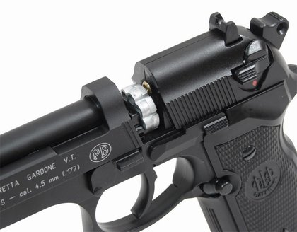 Пневматична Beretta 92 FS з двигуном CO2 є точною копією дуже популярної однойменної вогнепальної зброї. Ця копія на 100% виготовлена за ліцензією Beretta в німецькій компанії UMAREX і має оригінальне маркування, як і вогнепальна зброя. Його найбільші переваги: зроблено з металу та ідентичні розміри та вага оригіналу - коли ви берете цю рушницю в руки, створюється враження, що це справжня вогнепальна зброя.