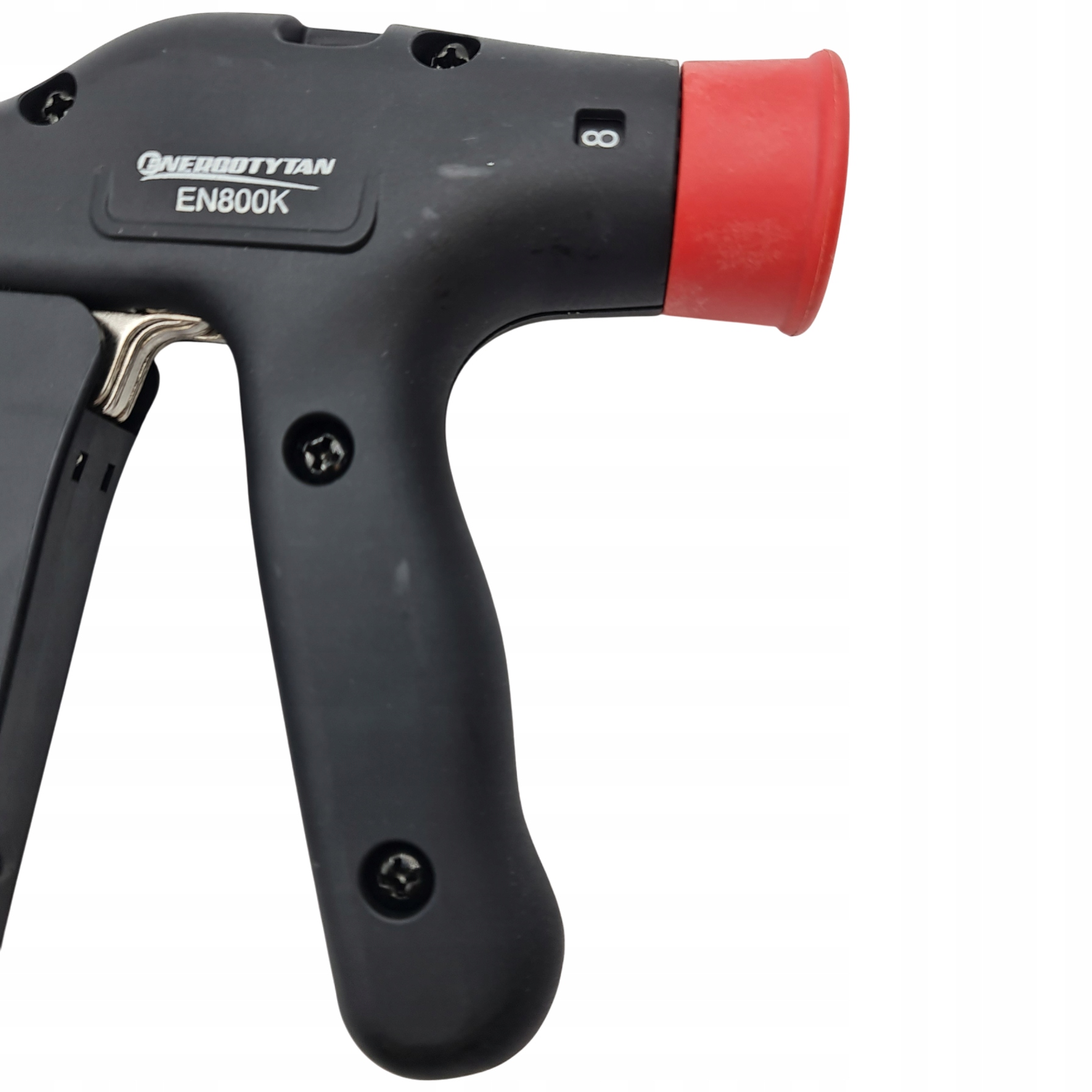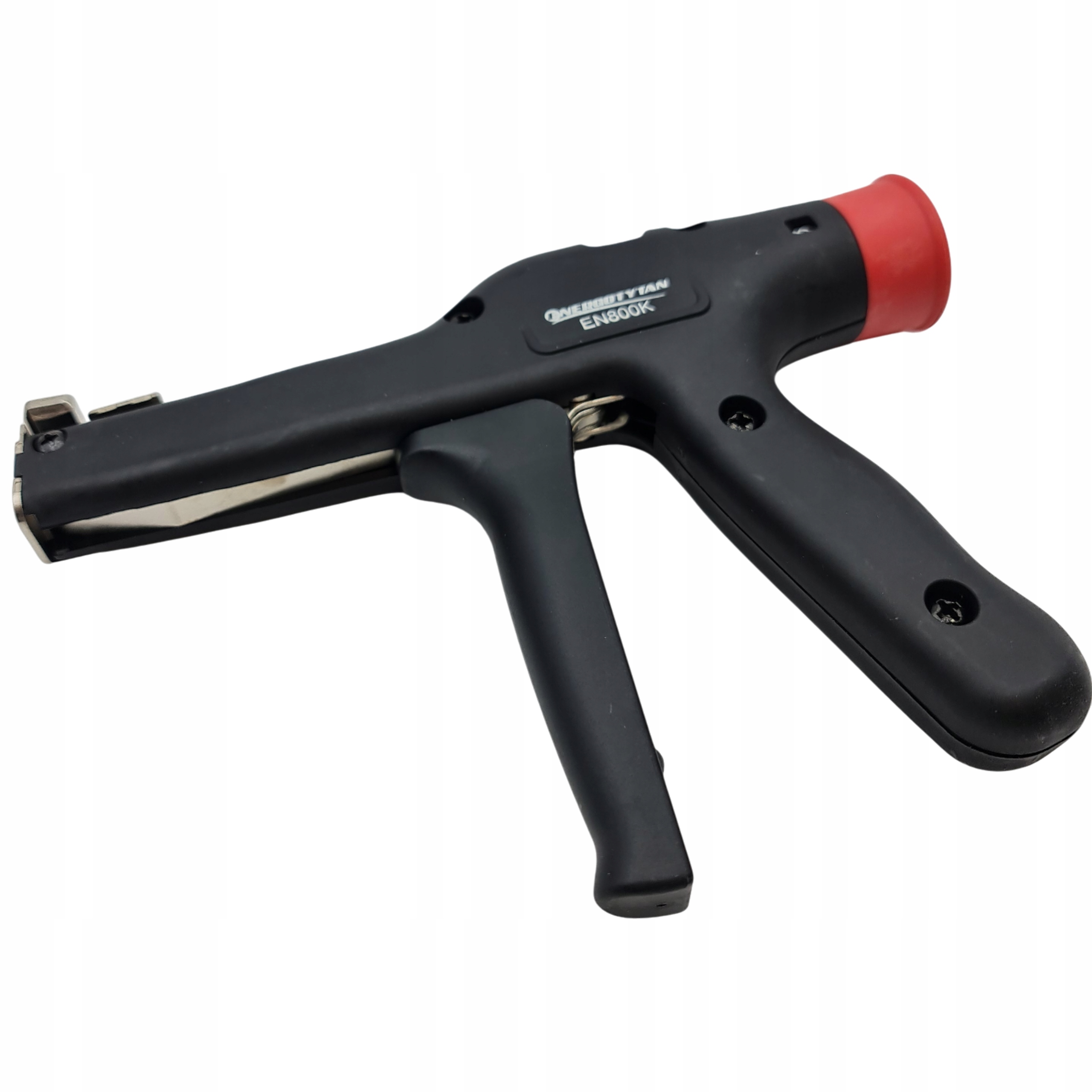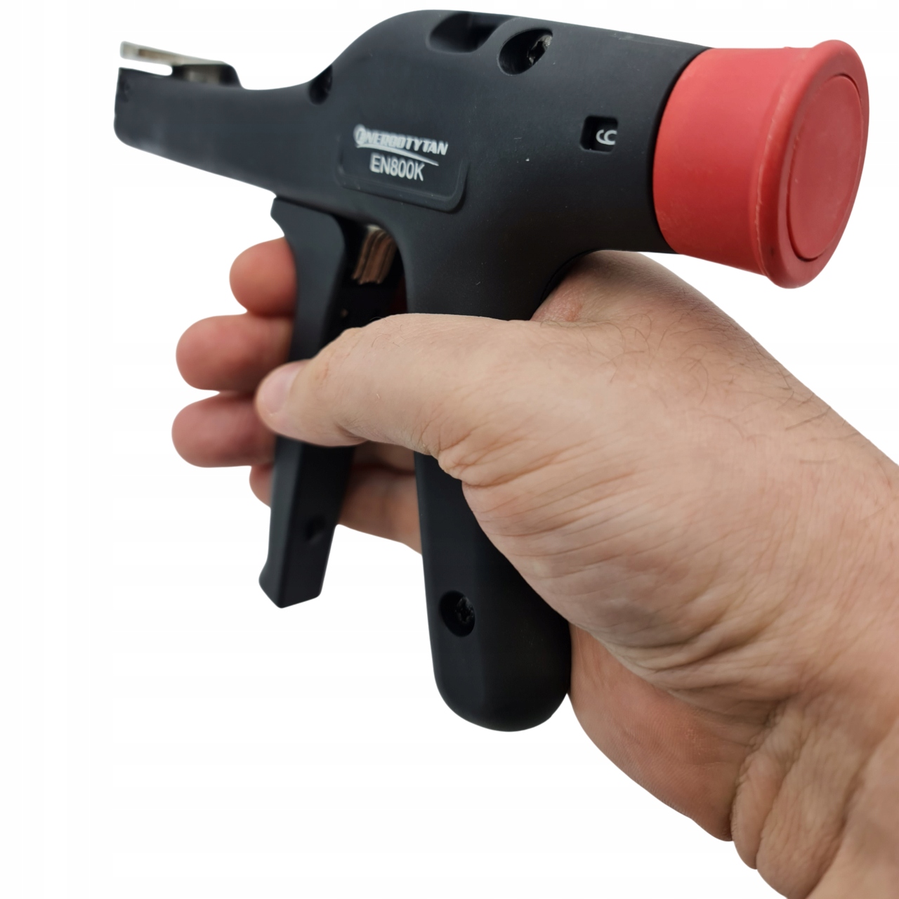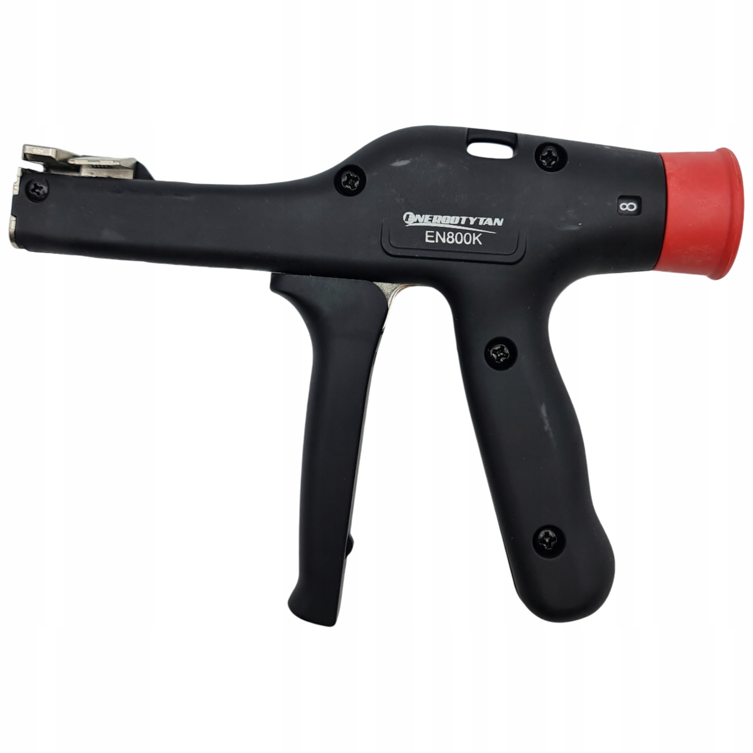 Пистолет для кабельних стяжок ENERGOTYTAN EN800K із армованого нейлону. Оснащений притискною ручкою, він дозволяє затягувати та відрізати кінці кабельних стяжок. Інструмент, корисний у роботі електрика, монтажника, на виробництві тощо, що сприяє швидкому виконанню завдань.