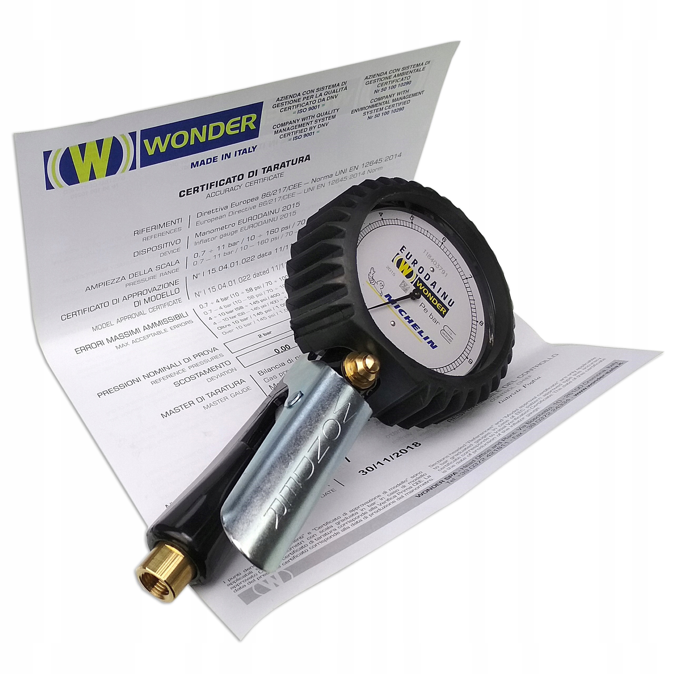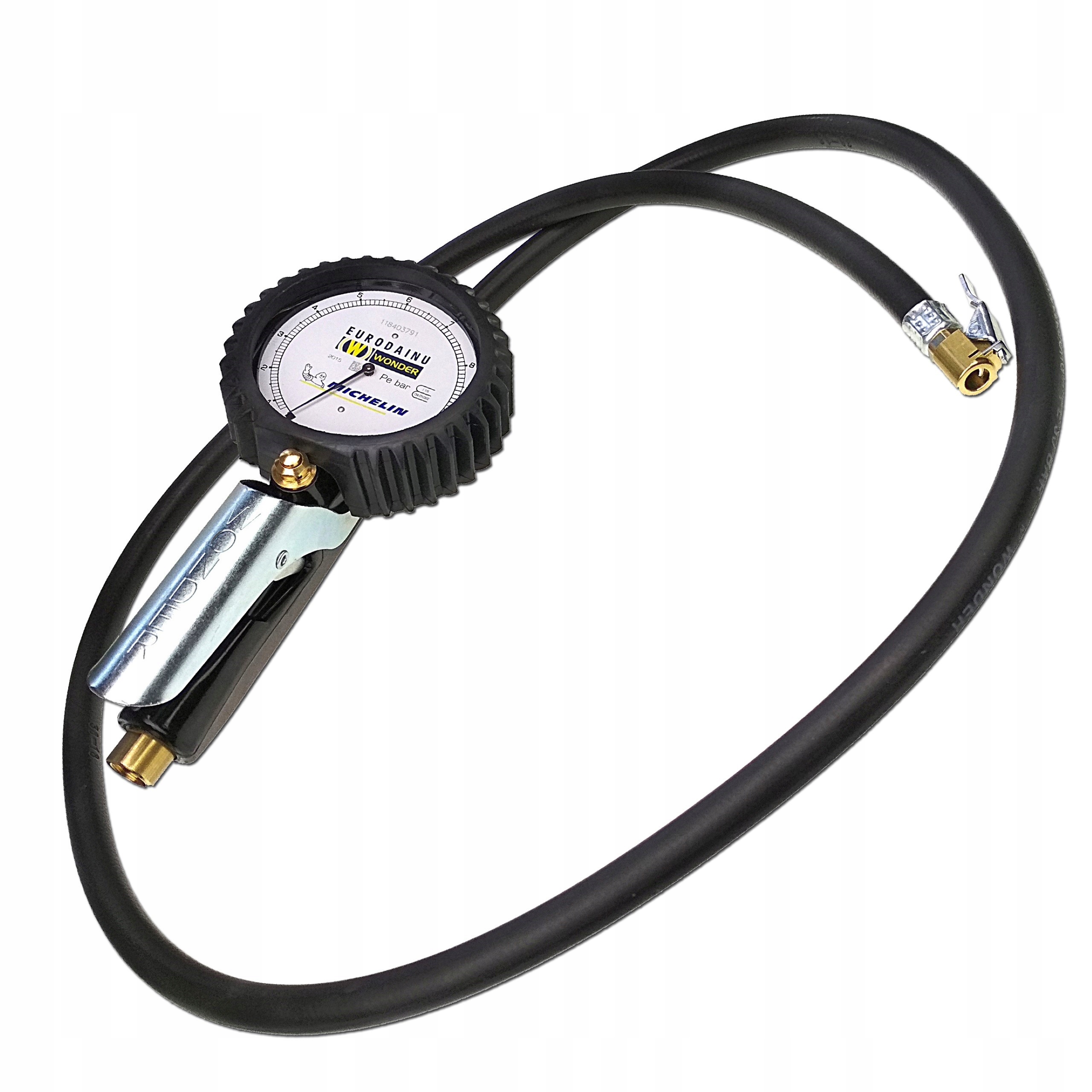 Пістолет для накачування шин Michelin Wonder Eurodain 2015 із манометром – це високоякісний пристрій, розроблений, виготовлений і сертифікований в Італії компанією Wonder – лідером у сфері постачання OEM клапани для автомобільної промисловості. Модель Eurodainu 2015 є продовженням визнаної моделі 1991 року, дизайн якої постійно вдосконалюється і гарантує надійність і точність. Клас приладу підтверджує логотип компанії Michelin, розміщений на циферблаті манометра.