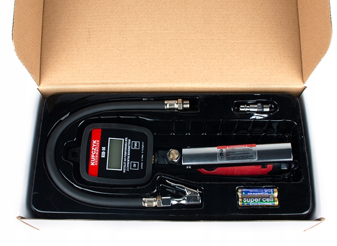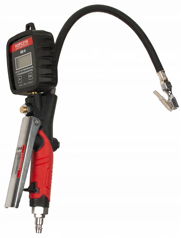 Професійний пістолет для накачування шин KID-14 Kupczyk оснащений чітким цифровим дисплеєм. Він вимірює тиск повітря з точністю до 1%, показуючи на дисплеї з точністю вимірювання 0,14 бар. Цифровий манометр забезпечує більшу довговічність і зручність, ніж аналогова версія. Відображає чотири типи вимірювальної шкали в діапазоні від 0 до 14B бар (200 PSI, 1400 кПа або 14 кгс/см2). Він має ергономічну ручку та корпус манометра, що забезпечує гарний огляд і легке використання.