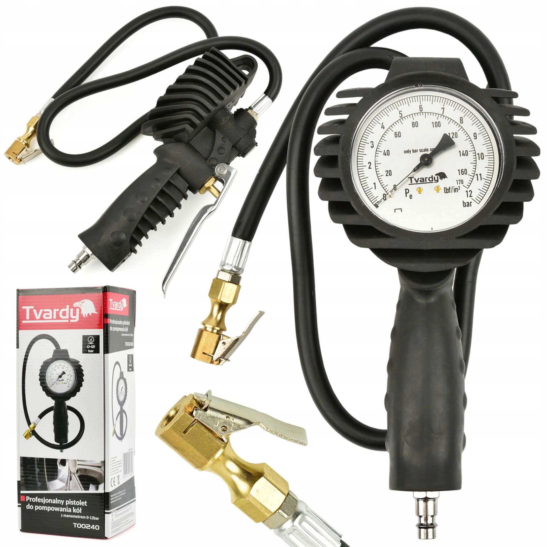Професійний пневматичний пістолет з великим манометром - для накачування коліс легкових і вантажних автомобілів. Оснащений гнучким шлангом довжиною 9-5 см і великим, легко читаним манометром діаметром 80 мм в гумовому чохлі, що захищає від ударів і ударів. Шкала вимірювання в двох одиницях – Psi, Bar. Швидкий роз’єм 1/4" забезпечує швидке підключення до компресора.