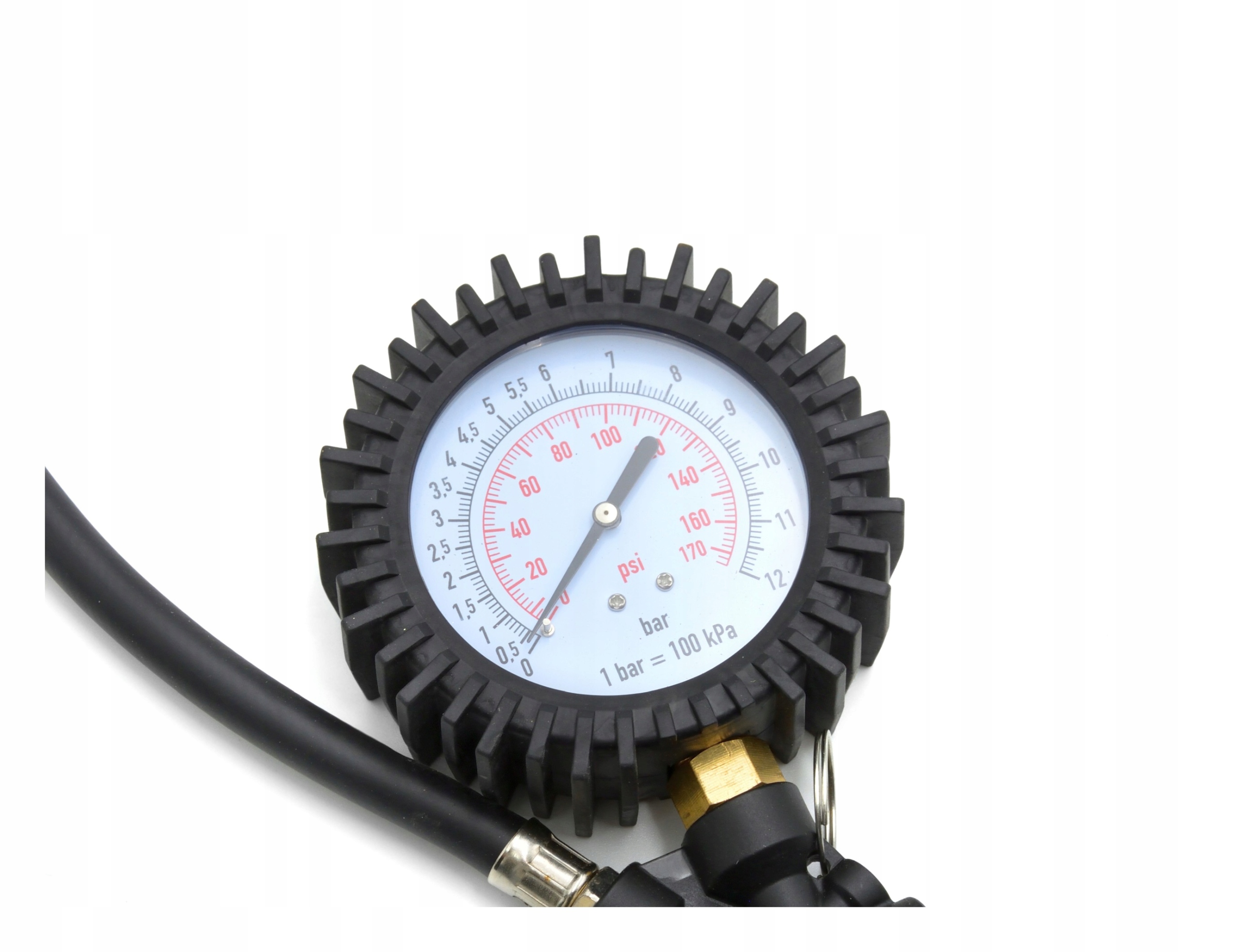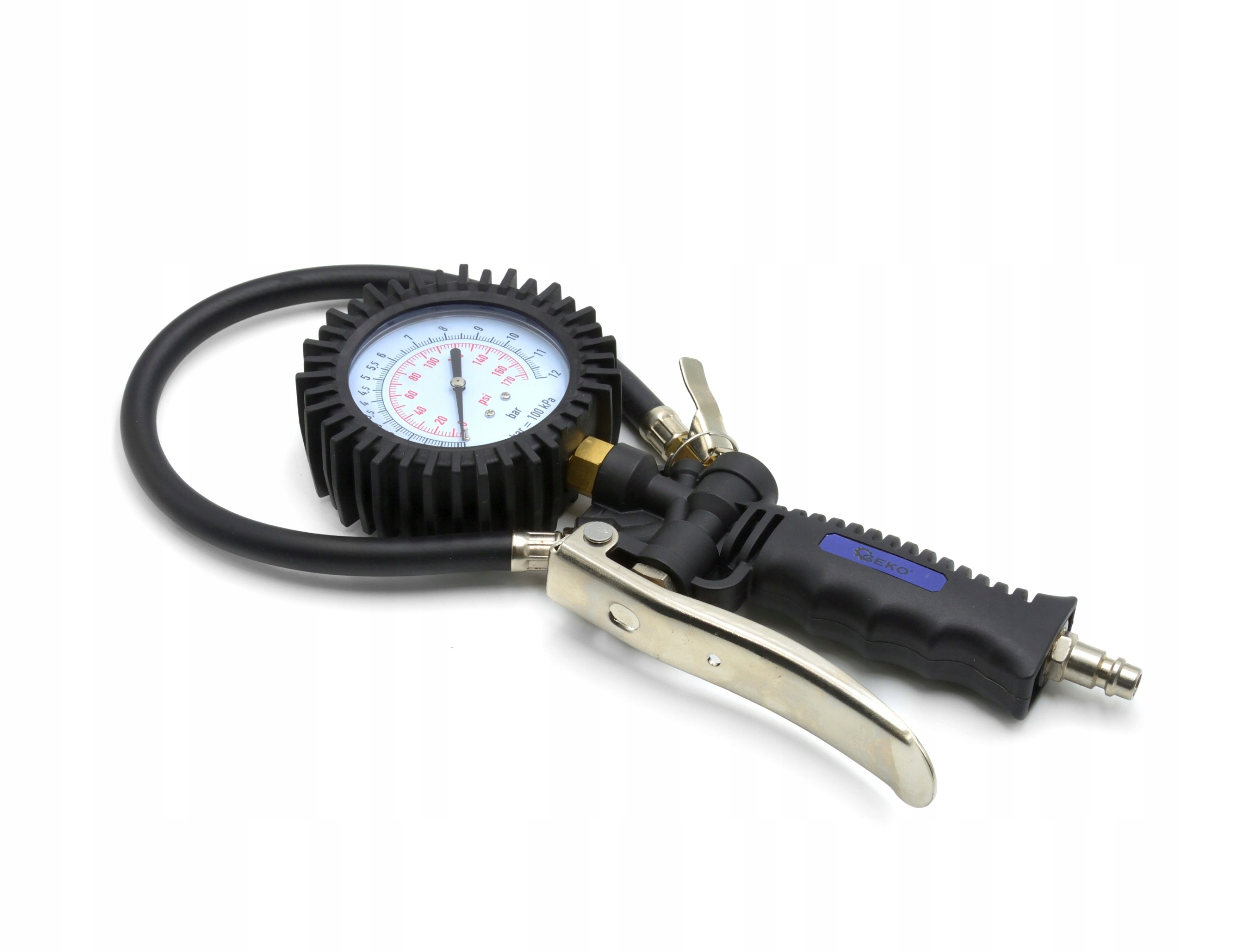 Професійний пневматичний пістолет з манометром - для накачування коліс легкових і вантажних автомобілів. Оснащений гнучким шлангом довжиною 45 см і великим, легко читаним манометром у гумовому чохлі, який захищає від ударів і ударів. Шкала вимірювання в двох одиницях - Psi і Bar. Швидкий роз’єм 1/4 дюйма дозволяє швидко підключити його до компресора.