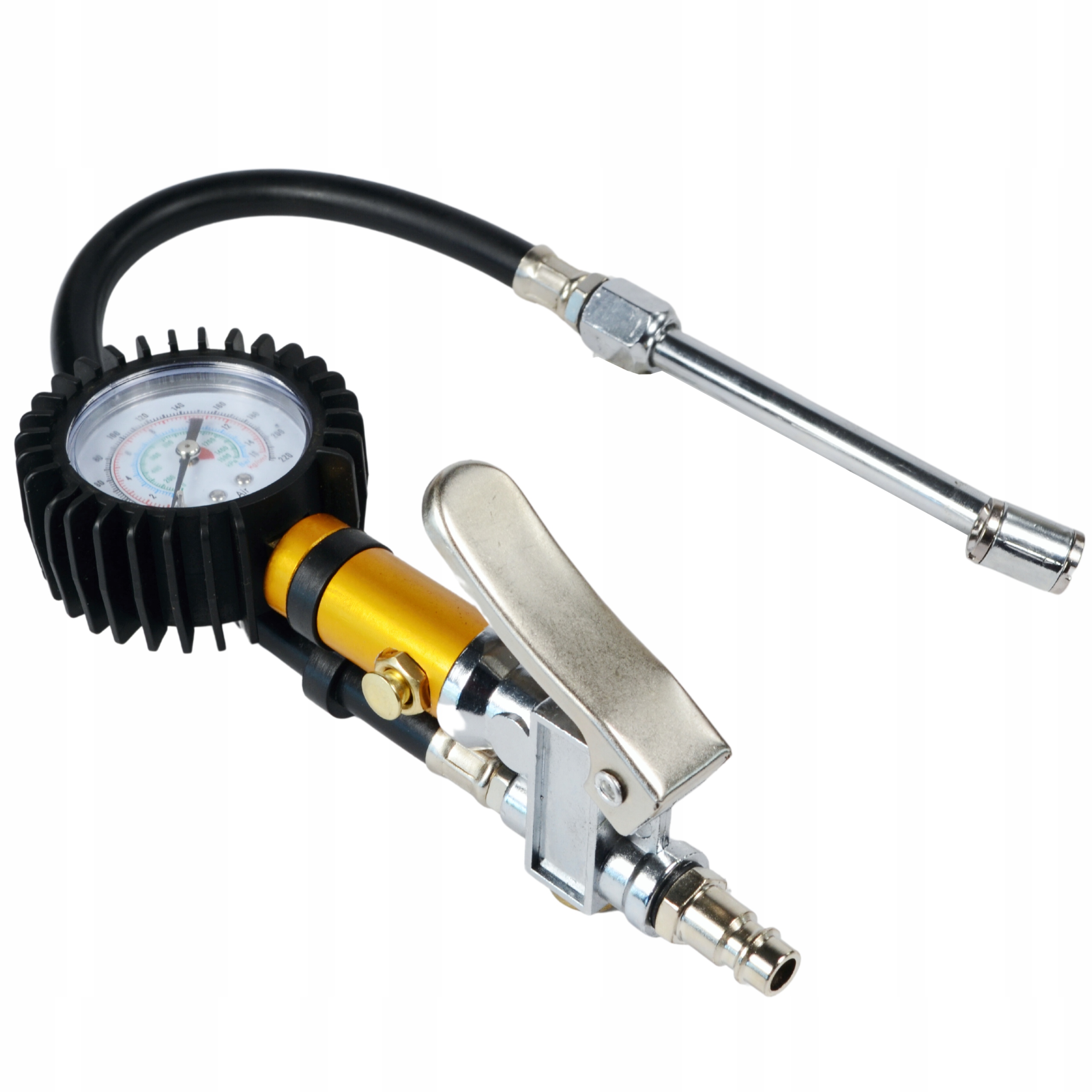 Пістолет — це професійний інструмент для накачування коліс стандартними автомобільними клапанами. Барометр захищений товстою гумою, яка захищає його від пошкоджень, які можуть виникнути внаслідок недбалого зберігання.