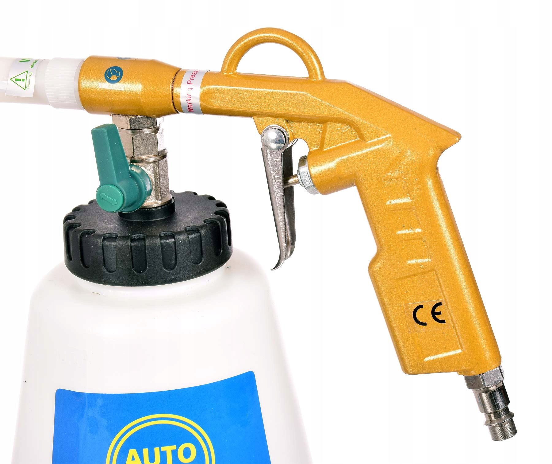 Пистолет можна використовувати для миття автомобільних сидінь, потолок, пластикових елементів, багажника. Для належної роботи все, що вам потрібно, це невеликий компресор, наприклад, 50 л, і рідина для прання тканин. Під дією тиску повітря шланг починає вібрувати і створює повітряний вихор, який здуває бруд. Крім того, всередині помаранчевої трубки є тонка прозора трубка, через яку можна застосовувати хімікат. Регулювання над баком дозволяє дозувати необхідну кількість миючого засобу. Ефекти помітні відразу.