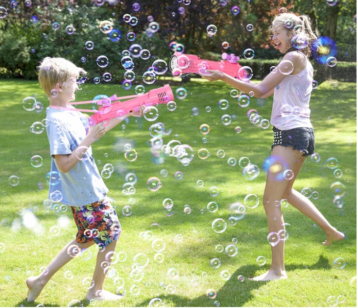 Рушниця працює повністю автоматично. Просто помістіть пляшку з рідиною всередину, і рушниця почне стріляти. Тисніть на курок у будь-який момент і милуйтеся чудовими бульбашками! Зброя також буде чудовою для заходів!