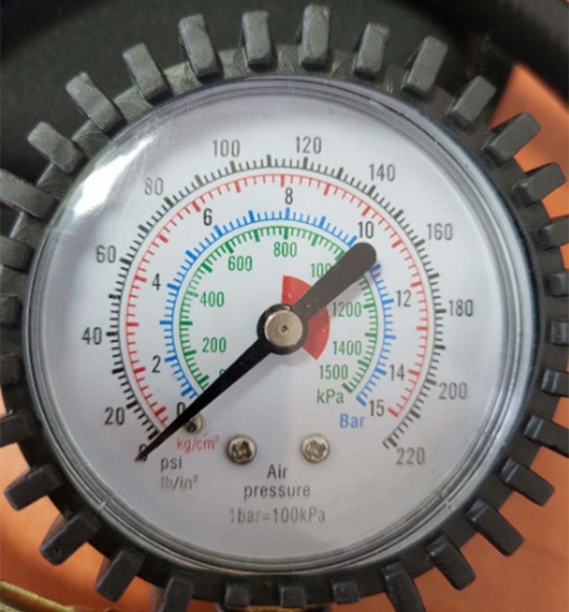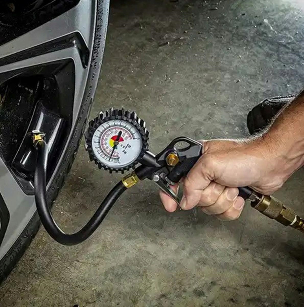 Пістолет з манометром використовується для накачування коліс зі стандартними розмірами автомобільних кранів. Годинник захищений спеціальною гумовою кришкою, що не ковзає, щоб захистити його від пошкоджень.