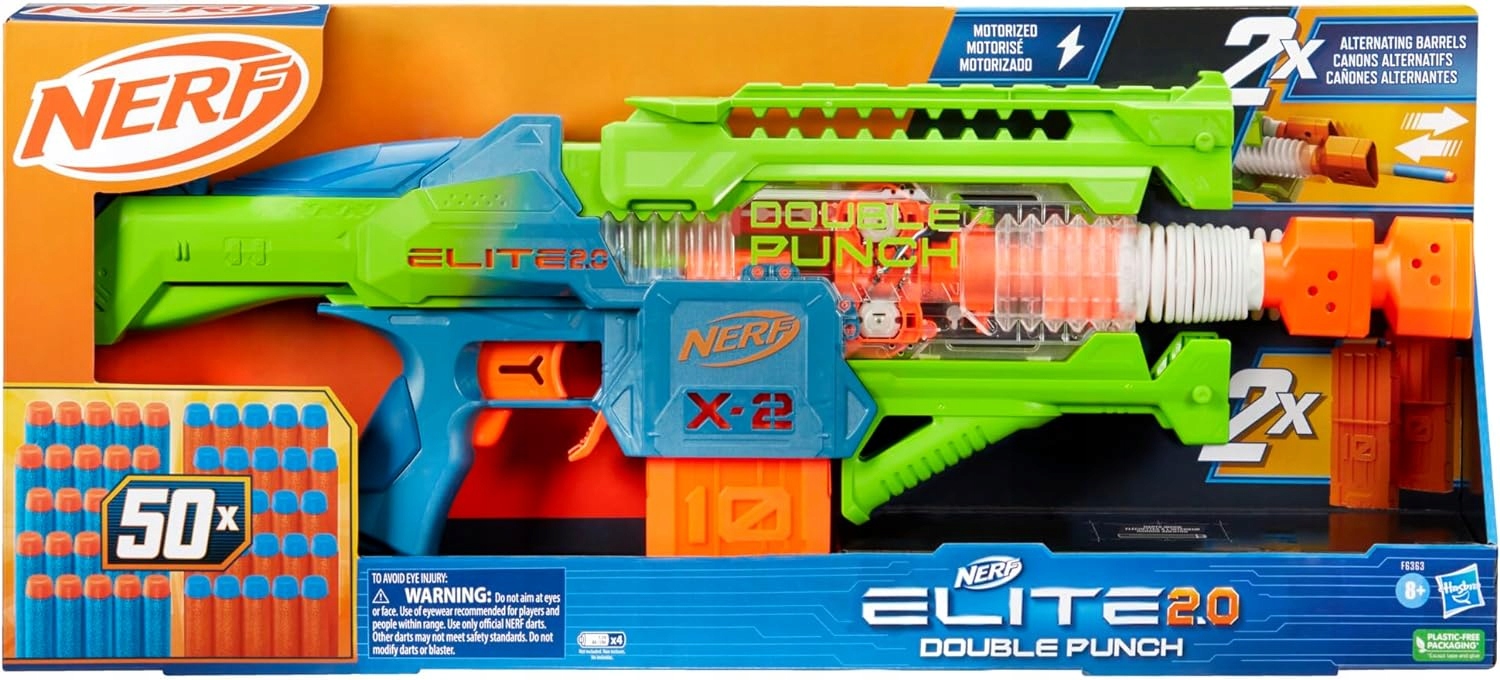 Double Punch — напівавтоматична пускова установка з двома рухомими стволами та двома магазинами на 10 патронів із системою обойми, завдяки чому ми маємо велику перевагу над супротивником. У наборі цілих 50 стріл двох кольорів. У верхній частині пускової установки є тактична планка, а під нею — тримач для дротиків. Тримач вміщає 10 стандартних елітних дротиків. Завдяки подвійному стволу і подвійним магазинам ви отримуєте перевагу над супротивником. При стрільбі патрони дістаються з магазинів по черзі. Подібно і зі стволами – кулі вилітають із стволів по черзі. Таким чином ви швидко переможете суперника на полі бою. Швидкість пострілу залежатиме від того, наскільки швидко ви зможете натиснути на курок.