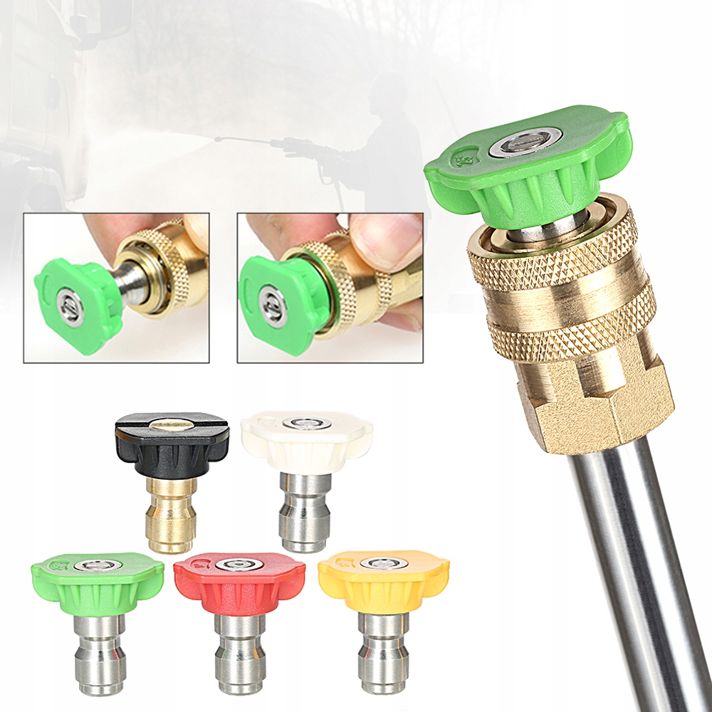 - Поставтеся з 5 кольоровими наконечниками насадок, різні кути розпилення дозволяють швидко й легко очищати важкодоступні місця.