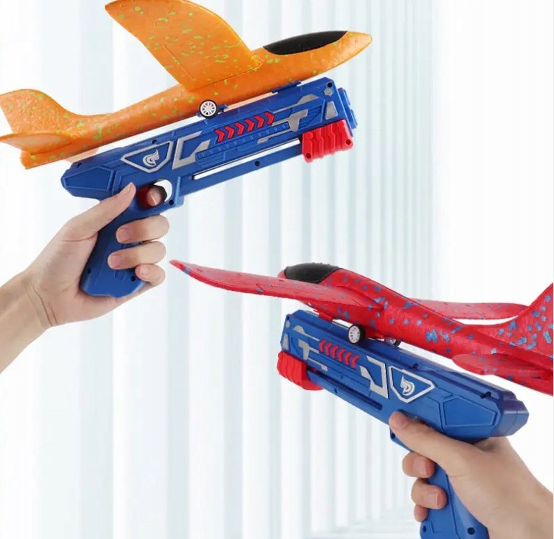 Іграшка складається з гармати та спеціально розробленого літака, який після встановлення в пістолет готовий. Просто натисніть на спусковий гачок і літак підніметься в повітря. Літак виготовлений з легкого і міцного матеріалу, що забезпечує тривалі і стабільні польоти.