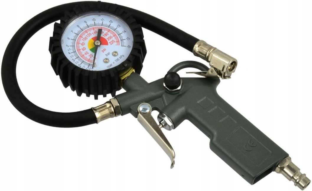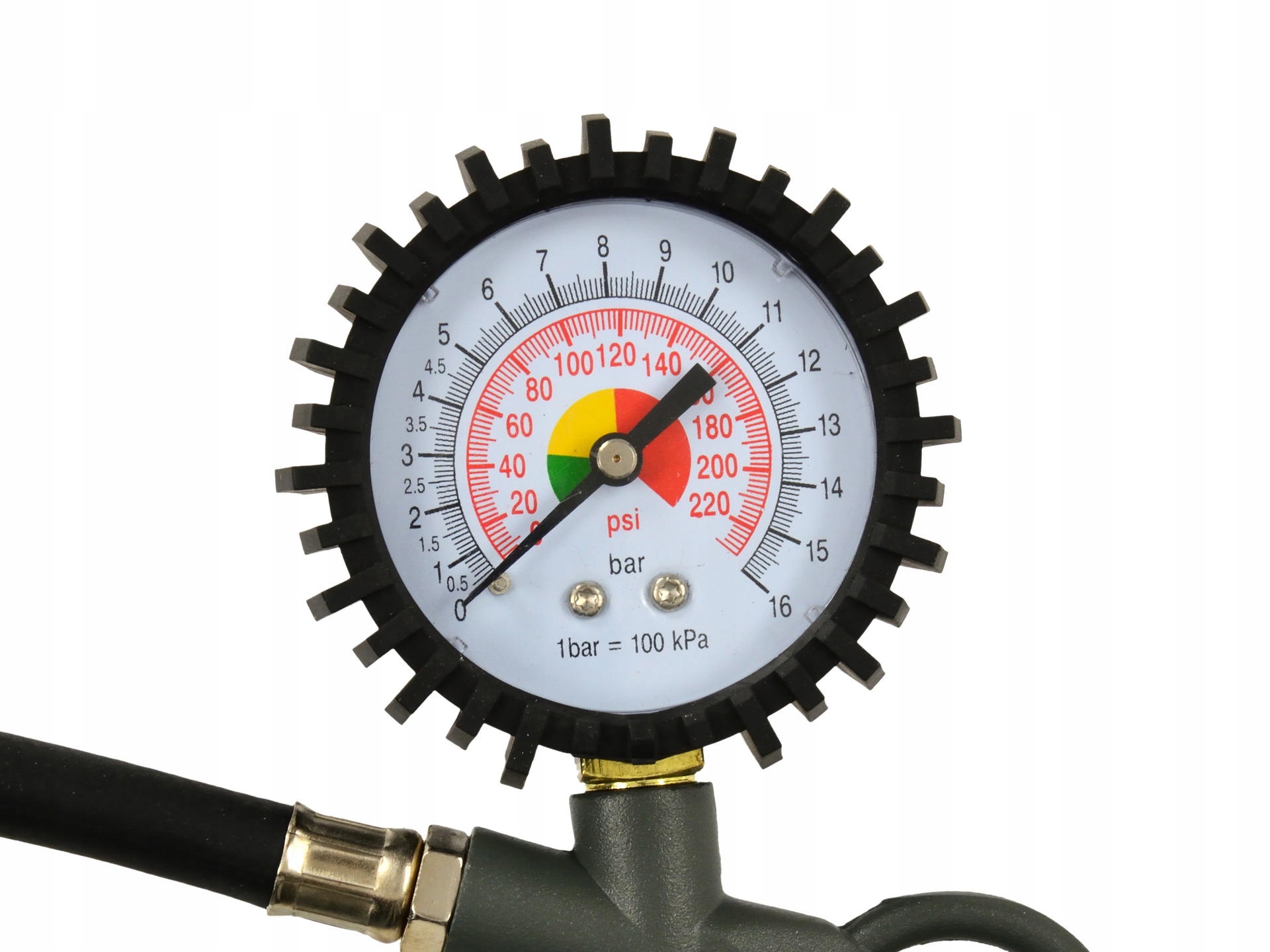 Пістолет для накачування з великим манометром Пістолет для накачування з манометром, призначений для накачування коліс. Пристрій дозволяє накачувати автомобільні, велосипедні та інші колеса, оснащені стандартними автомобільними клапанами. Пістолет оснащено вбудованим пневматичним курком і стандартним пневматичним підключенням 1/4 дюйма