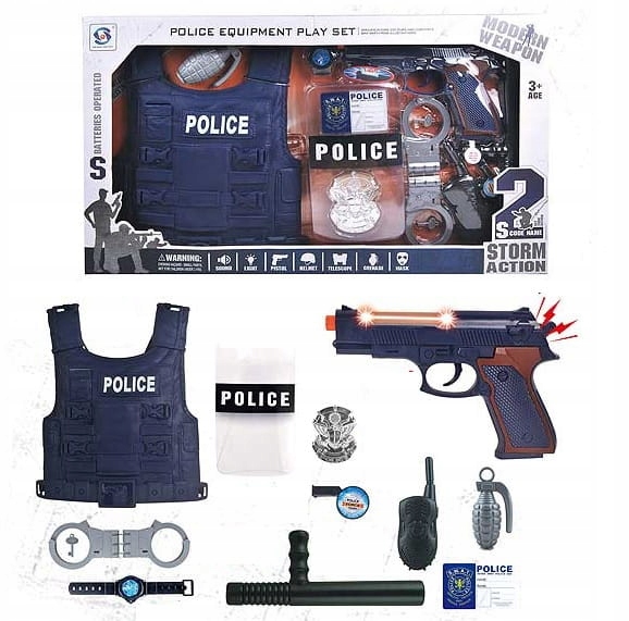 PISTOLET ZESTAW KAMIZELKA POLICJANT ŚWIATŁO DŹWIĘK