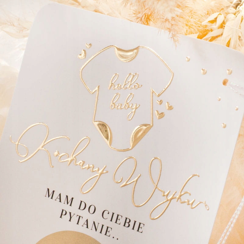 Скретч-картка — це оригінальний спосіб попросити кохану людину стати хрещеним батьком вашої дитини. Листівка має гарне золоте тиснення.