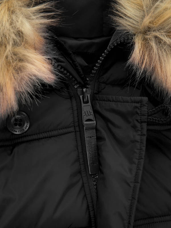 - Утеплена, з коміром-стійкою та інтегрованим капюшоном зі знімним хутром.