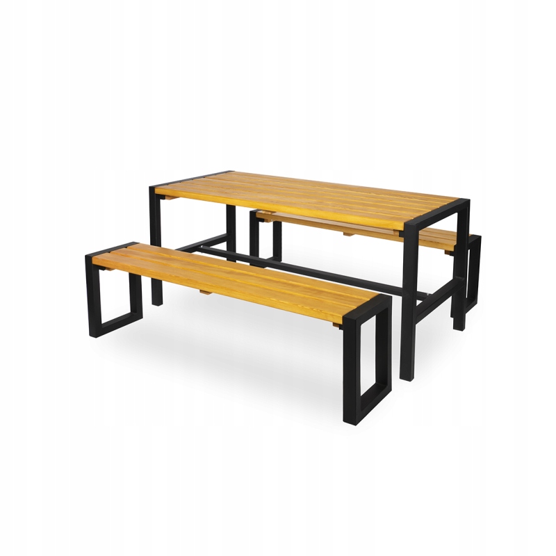 Пивний набір WOODY FRESH характеризується сучасним зовнішнім виглядом, високою міцністю та функціональністю. Набір складається з двох лавок і столу. Дерев’яні елементи виготовлені з масивних соснових смуг товщиною 40 мм, лакованих світло-коричневим лаком, а рами – з міцної сталі з профілем 40х60 мм, пофарбованого порошковою фарбою в чорний колір. Набори призначені для інтенсивного використання в садах закладів HoReCa. Максимальне навантаження на стільницю - 120 кг, а на лави - 320 кг. Набори стійкі до таких погодних умов, як дощ або сильне сонце