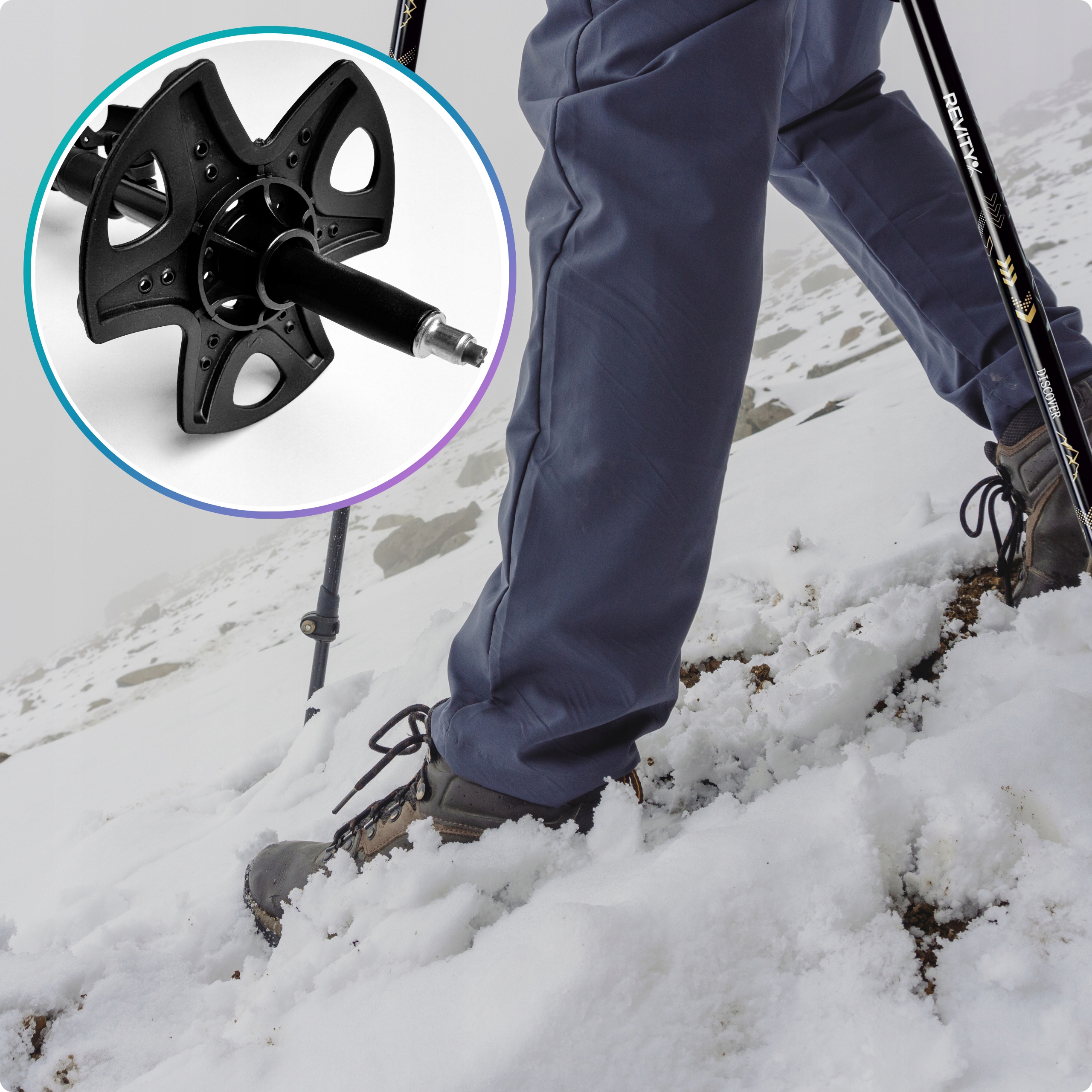 Саме тут відкриття полюсів відчувають себе найкращими. Набір включає 8 порад : на снігу, грязі, асфальті, гравійному або нерівному ґрунті. Пластини запобігають полюсам у заболоченій області, а кінчик, виготовлений з міцного матеріалу, забезпечує зчеплення навіть на скелях.