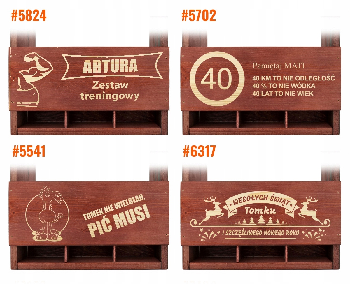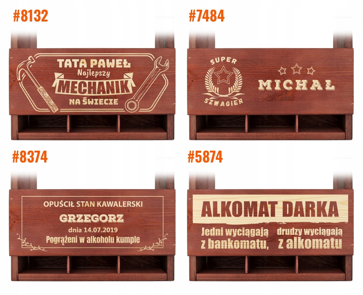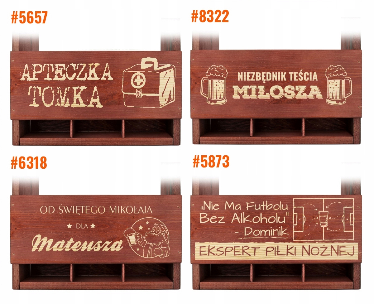 У нас є для вас чудова ідея подарунка — персоналізована дерев’яна переноска для пива! Товар виготовлено польським виробником. Збоку на чохлі прикріплена відкривачка з високоякісної нержавіючої сталі. Чудово підійде як подарунок на день народження, іменини, день батька чи новосілля. Ми зробимо індивідуальне гравіювання безпосередньо на поверхні коробки, що зробить її чудовим сувеніром. Це не тільки практичний подарунок, а й ефектне доповнення інтер'єру. Коробки можуть мати характерні недоліки - це не дефект, а навмисний візуальний ефект.