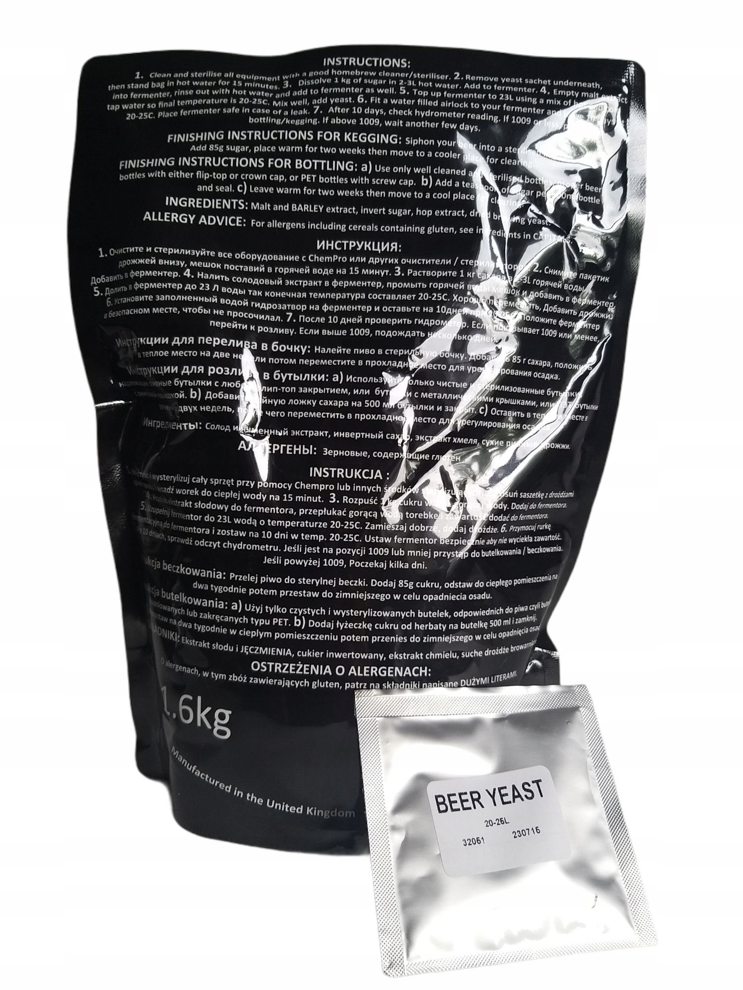 Кожний набір для заварювання містить пакетик пивних дріжджів та інструкцію з приготування польською мовою.