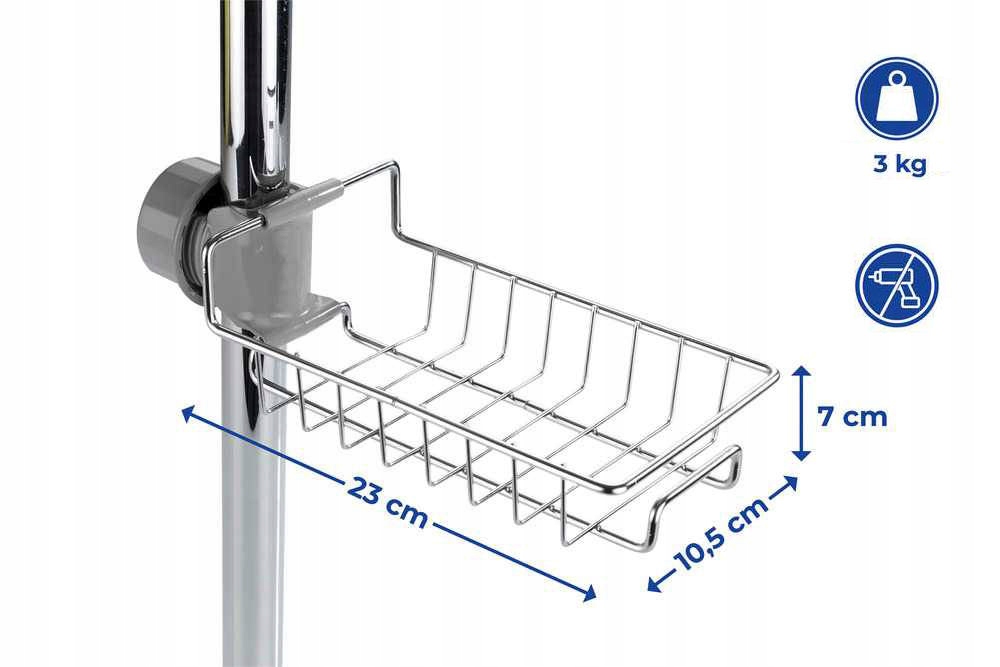 Поличка для ванної під змішувач 23 х 10,5 х 7 см a Чудове рішення для людей, які цінують мінімалізм і порядок. Це чудова альтернатива великим меблям для ванної кімнати, які швидко деформуються при контакті з водою. Що відрізняє його від стандартних полиць для ванної кімнати, так це легкість монтажу. Вам не потрібно витрачати свій вільний час на збирання меблів, все, що вам потрібно зробити, це просто затягнути тримач полиці на стрижні душової кабіни, і все!