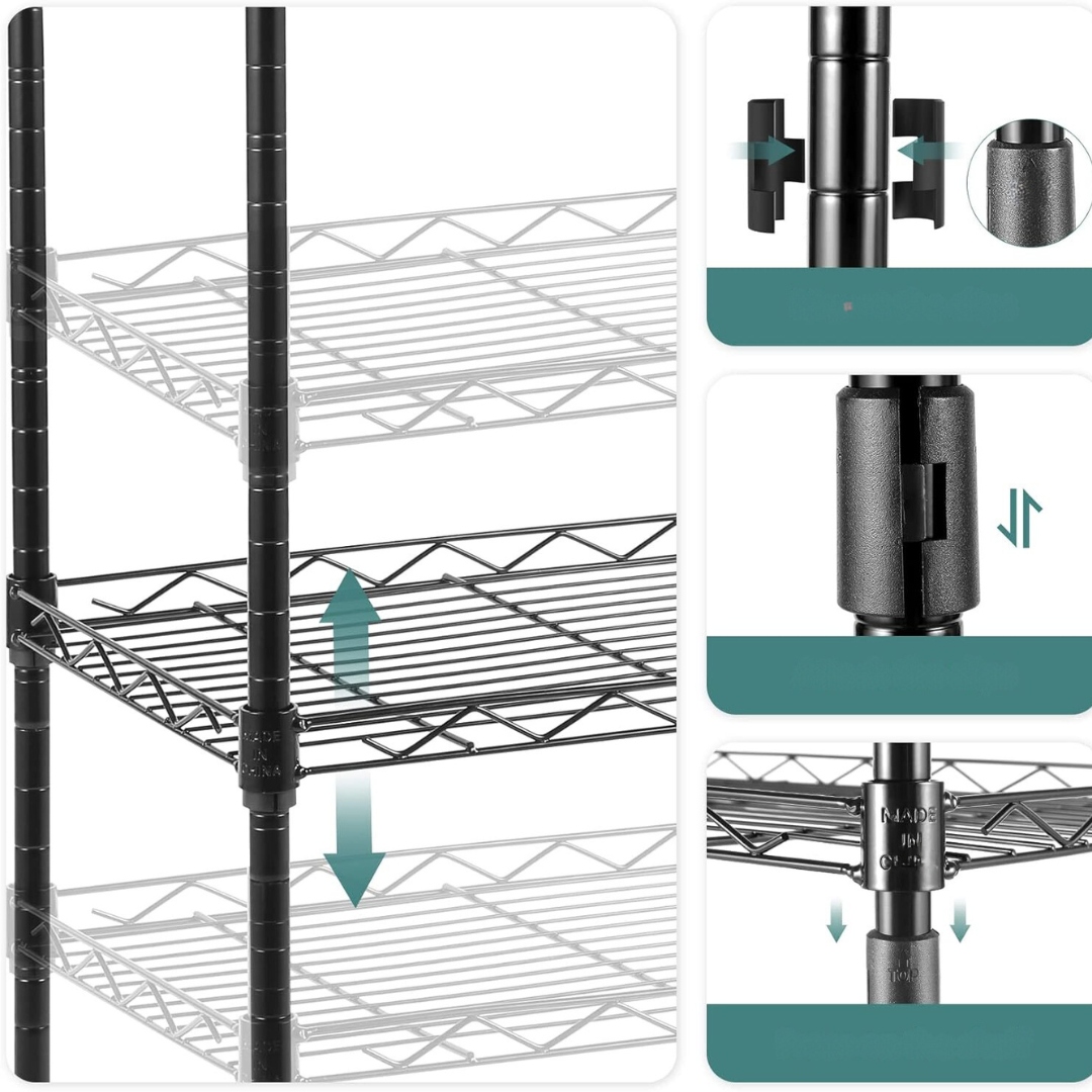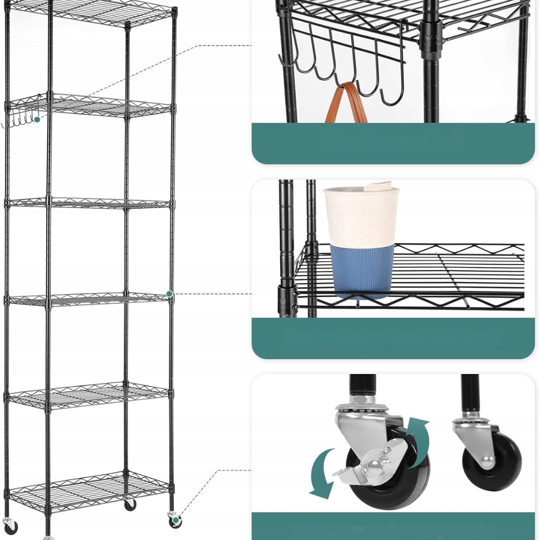 Półka regał regulowany, 6 poziomów, na kółkach mobilna mocna z haczykami