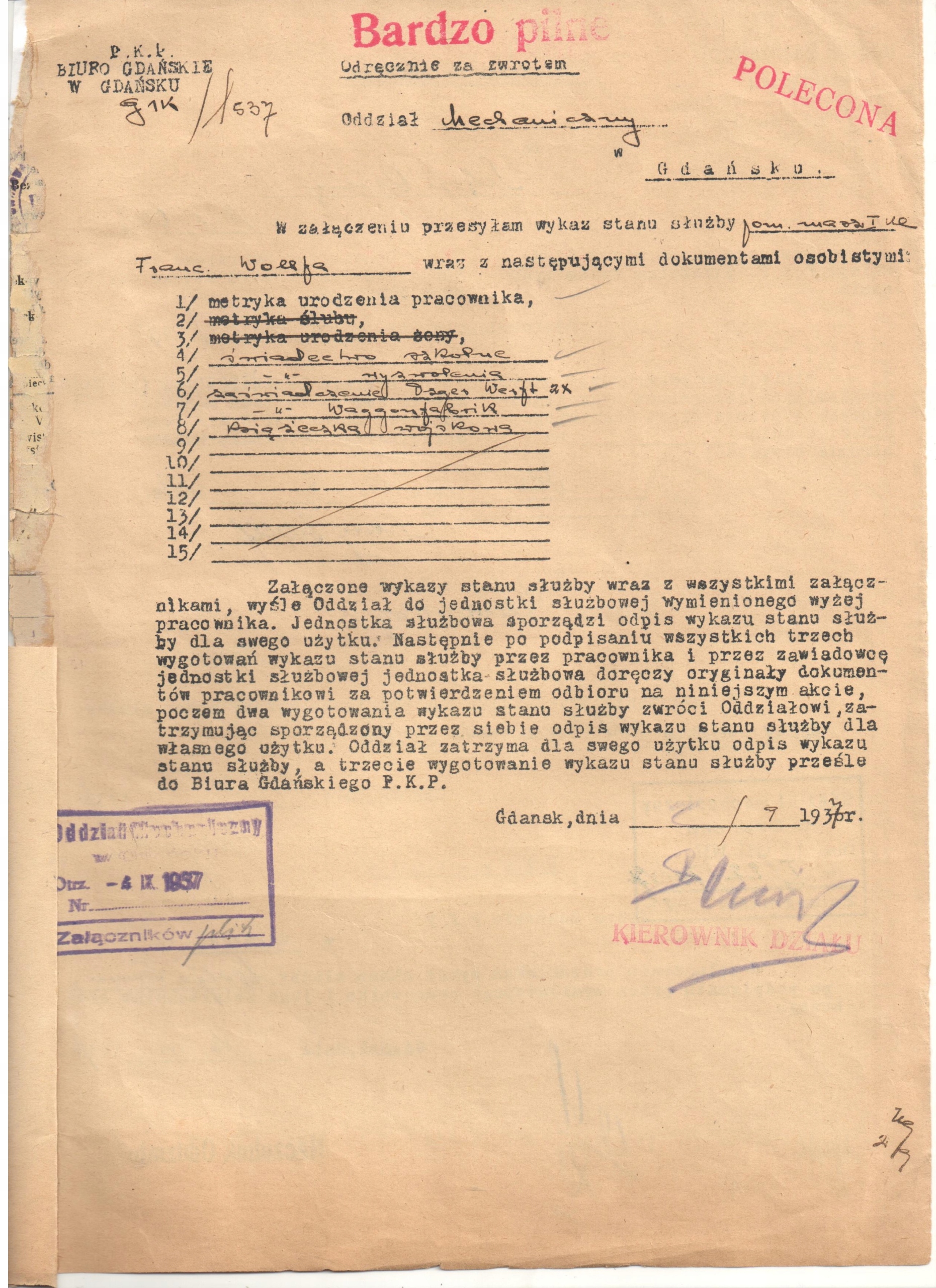 PKP Гданський офіс у Гданську - WMG - 2 x лист - Гданськ1937