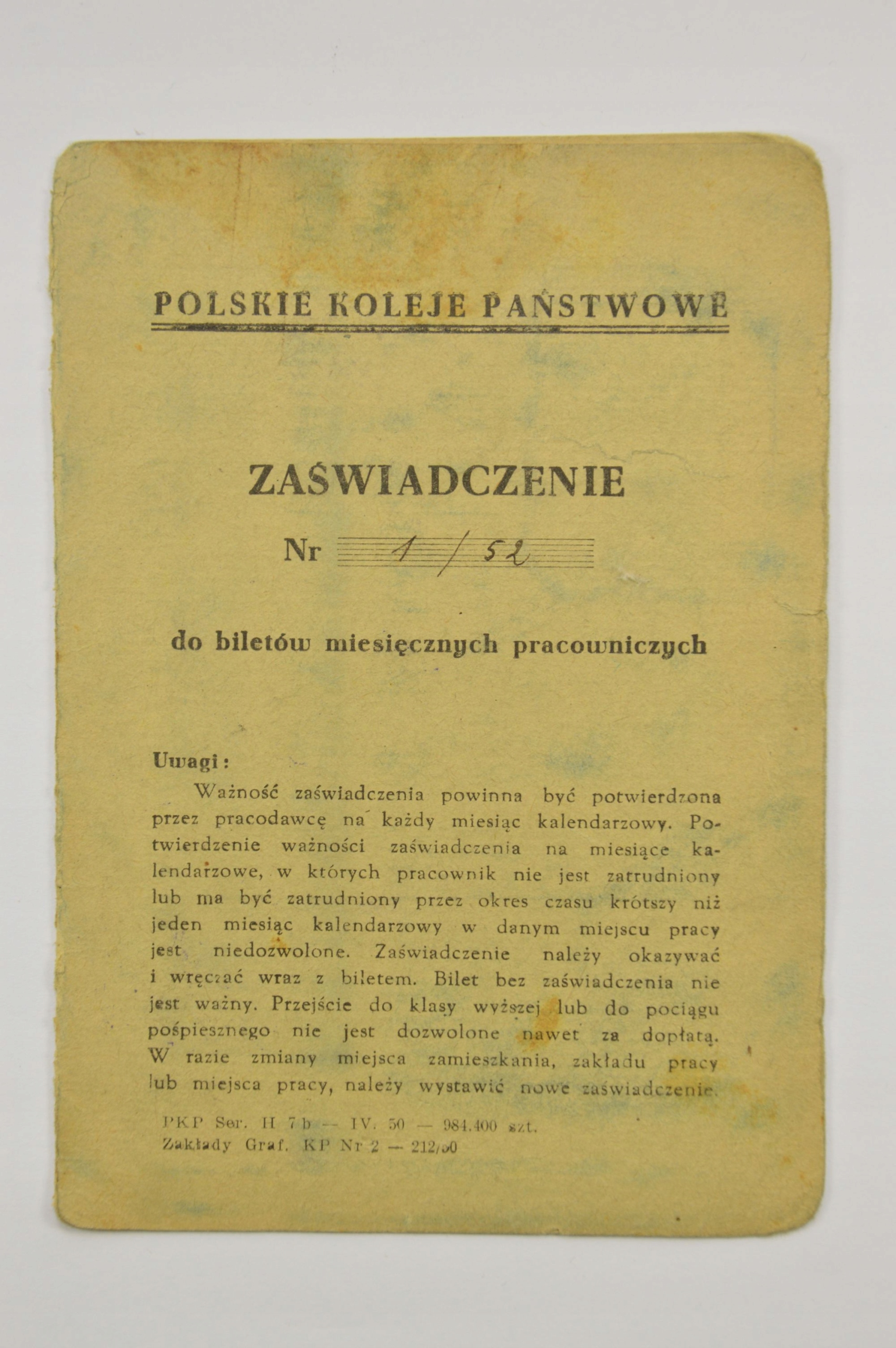 PKP GDAŃSK WRZESZCZ 1952 r. ZAŚWIADCZENIE DO BILETÓW MIESIĘCZNYCH PRACOW.