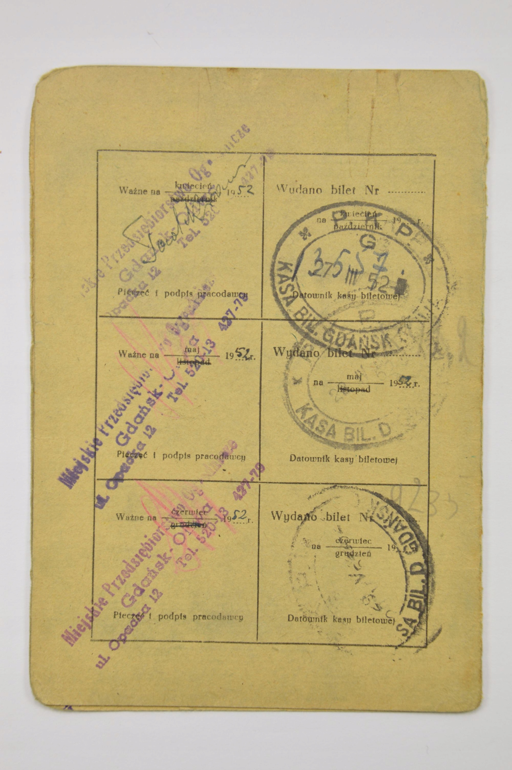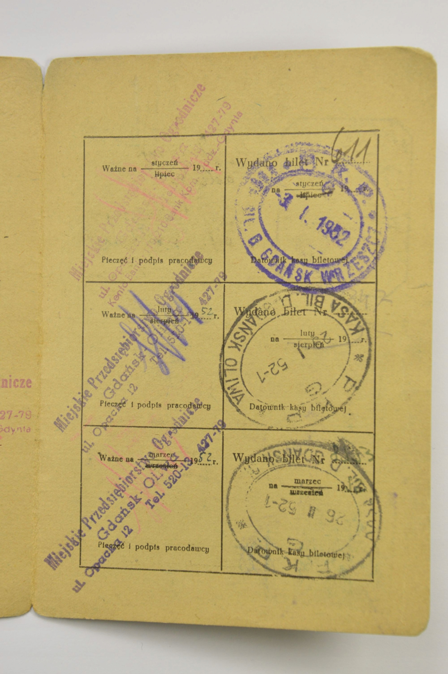 PKP GDAŃSK WRZESZCZ 1952. ПОСВІДЧЕННЯ НА РОБОЧИЙ МІСЯЧНИЙ КВИТОК.