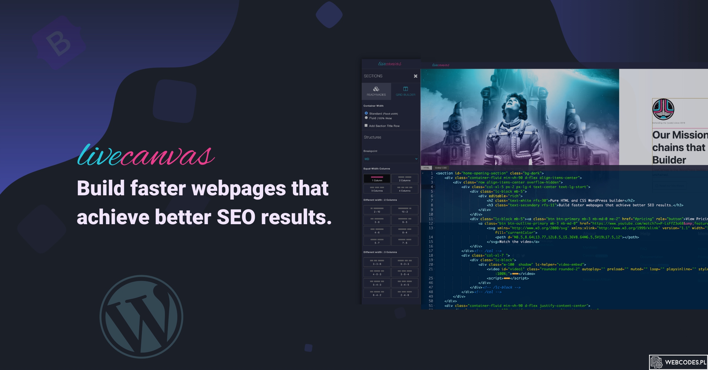 Конструктор сторінок WordPress Bootstrap 5 для веб-дизайнерів | Чистий HTML і CSS WordPress Builder Оптимізуйте свій процес розробки за допомогою готових шаблонів сторінок і розділів HTML LiveCanvas постачається з чудовою колекцією фрагментів HTML Bootstrap 5, які ви можете безкоштовно використовувати у своїх чудових дизайнах веб-сайтів: надійні, повністю адаптивні, перевірені в боях на різноманітних пристроях. Розширений редактор коду у ваших руках Якщо ви взагалі ненавидите конструктори сторінок, спробуйте LiveCanvas: єдиний конструктор сторінок, який генерує надзвичайно чистий, сумісний із Bootstrap 5 код HTML5, який можна покращити за допомогою вбудованого редактора живого коду. Технології, яким можна довіряти LiveCanvas дозволяє використовувати стандартні веб-мови, як-от HTML і CSS, у своїх дизайнах без прив’язки до постачальника, допомагаючи вам стати кращим веб-дизайнером, а не «плагіном». Використовуйте стандартні блоки або створюйте власні LiveCanvas допомагає створювати чудові веб-сайти, візуально поєднуючи фрагменти HTML, які ми називаємо «блоками». Це дозволяє відразу почати роботу, використовуючи готові блоки або створити власні. Творчість не має меж!
