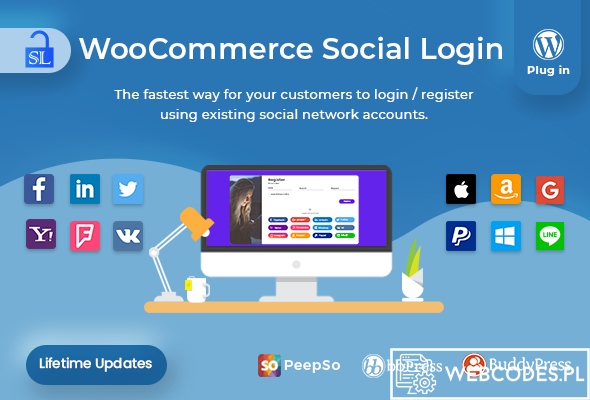Woocommerce Social Login - це плагін, який дозволяє користувачам увійти в систему використання своїх облікових записів на популярних соціальних платформах, таких як Facebook, Google, Twitter, LinkedIn та багато інших. Завдяки цьому клієнти можуть швидко зареєструватися або увійти в магазин, не потребуючи вручну заповнювати реєстраційні форми. Плагін покращує комфорт покупок, скорочуючи час входу та реєстрацію, що призводить до більшої кількості перетворень.