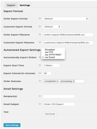 Плагін WooCommerce Order/Customer CSV Export дозволяє експортувати індивідуальні або масові замовлення за запитом або автоматично експортувати через FTP, HTTP POST або електронну пошту.