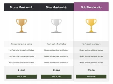 Додайте привабливі таблиці цін до своїх публікацій і сторінок. Показуйте різноманітні характеристики продукту, а потім дозвольте відвідувачам додати вибраний продукт у свій кошик за допомогою розширення Таблиці цін на вітрині. Додайте привабливі таблиці цін на ваші веб-сайти. Діаграми цін — це ефективний спосіб показати різницю між невеликою кількістю товарів. Обмінюйтеся функціями між різними підписками або складними продуктами, а потім надайте відвідувачам можливість додати вибраний продукт у свій кошик за допомогою розширення Таблиці цін у вітрині.