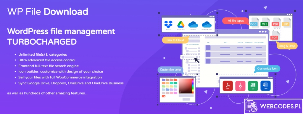 WP File Download — плагін файлового менеджера WordPress. Отримайте найпростіший, але найпотужніший файловий менеджер WordPress. Створіть категорію файлів, перетягніть файли та вставте категорію файлів або окремий файл безпосередньо у свій вміст. WP File Download пропонує багато професійних функцій, таких як система повнотекстового пошуку та повна інтеграція з Google Drive, Dropbox, OneDrive із двосторонньою синхронізацією файлів.