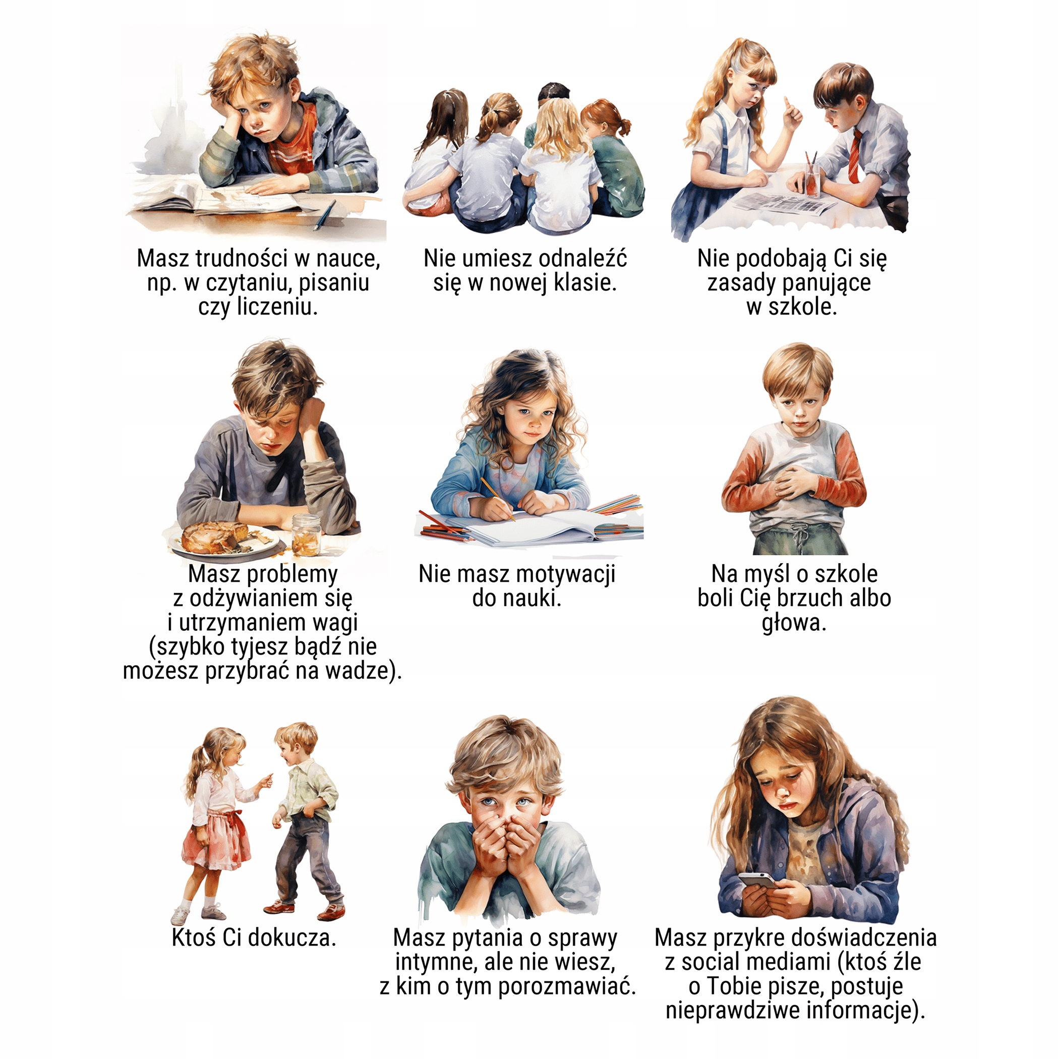 Цей плакат допомагає їм зрозуміти, у яких ситуаціях шкільний консультант може їх підтримати. Це дає чітке повідомлення про те, що дитина не повинна вирішувати свою проблему сама, і це зробить її більш впевненою, що вона знає, де шукати підтримки, якщо це необхідно. І навіть якщо він поки що не зміг назвати своє завдання, такий плакат дає йому змогу краще визначити сфери, у яких шкільний консультант може допомогти.