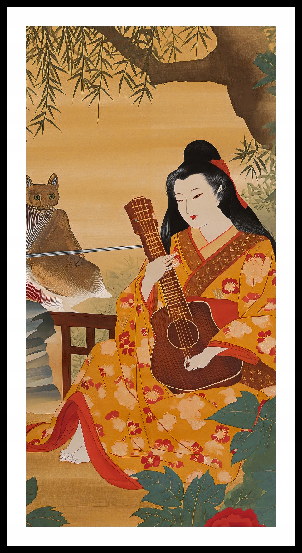 Плакат із циклу східних мотивів «Музика і поети». На ньому зображено чарівно стилізовану гейшу, яка грає на традиційній гітарі в оточенні ідилічного японського саду. Яскраві кольори її кімоно, прикрашеного квітковим мотивом, гармоніюють із теплими відтінками бамбука та квітучими квітами на задньому плані. Її супроводжує фігура білки, яка додає сцені легкості та ігрового характеру. Цей плакат випромінює спокій і задумливість, привертаючи увагу делікатними деталями та багатством східних культур. Ідеально підходить для інтер’єрів в азійському стилі, від приватних віталень до студій для медитації чи ресторанів східної кухні.