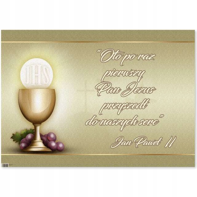 Плакат для причастя розміром 68х48 см — чудова прикраса, яка підкреслить важливість церемонії в цей особливий день. На плакаті зображено Господаря та цитату Блаженнішого Папи Отця Івана Павла ІІ – нашого земляка: «Вперше Господь Ісус прийшов до наших сердець» Іван Павло ІІ