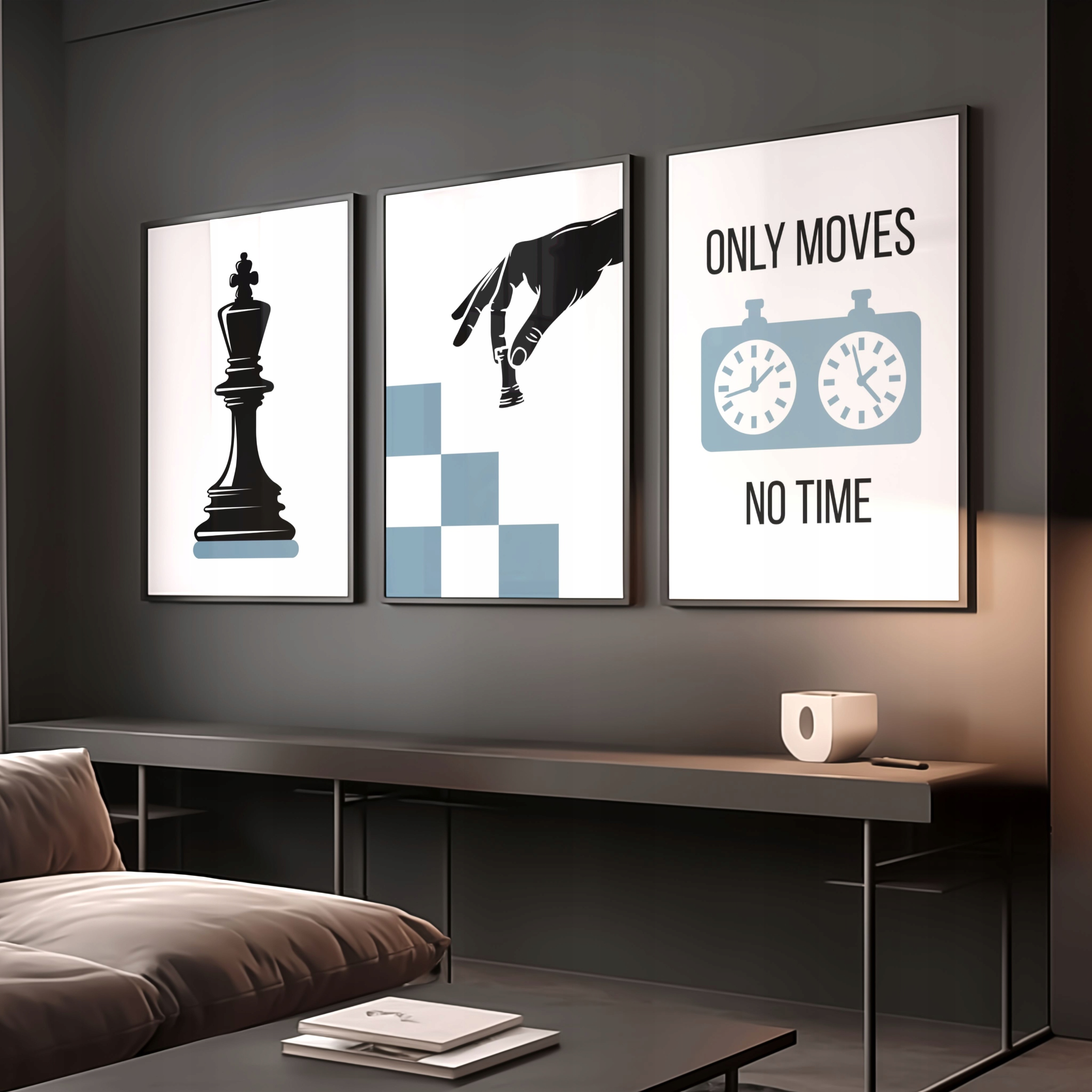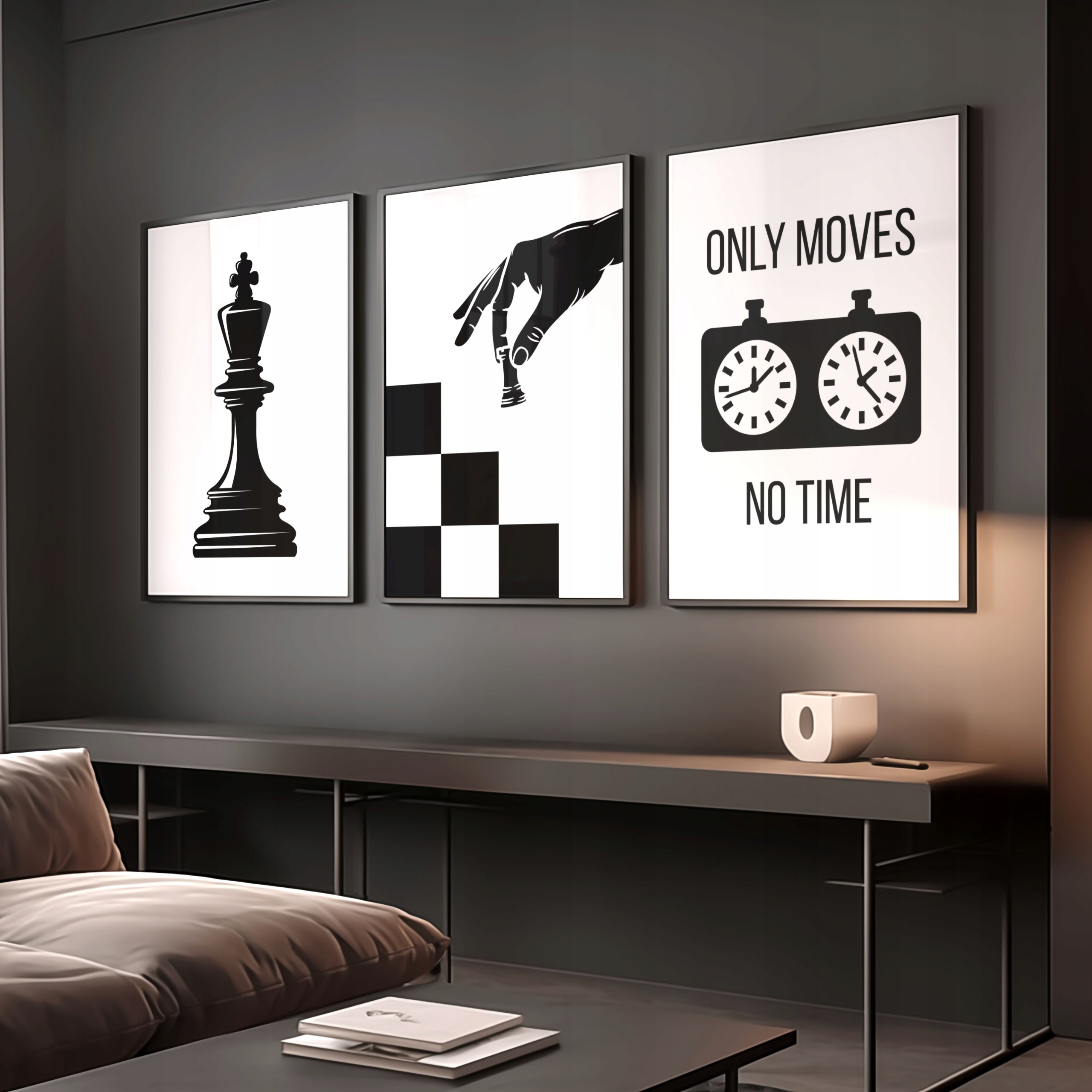 Це ідеальна прикраса для молодіжної кімнати, офісу, вітальні чи ігрової кімнати. Мінімалістична графіка з мотивами фігур, шахової дошки та шахового годинника додасть інтер’єру характеру та елегантності.