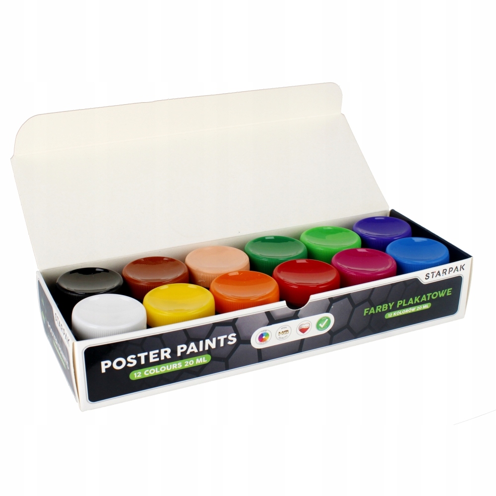 фарби плакатів Starpak доступні в наборах 12 кольорів. Кожен колір у закритому ємності потужністю 20 мл. Їх можна тривалий час зберігати. Що робити, якщо вони висохнуть через кілька років? Немає проблем. Просто додайте трохи води, і фарби відновлять їх первісну консистенцію.